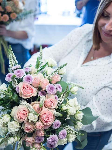Ako ďalšie sme sa učili viazať kytice. Poviem vám, že je to oveľa ťažšie, ako sa na prvý pohľad zdá. Udržať kvety v správnom poradí a smere je skrátka záležitosť vyžadujúca si prax. Ja na tej mojej plánujem pracovať a zároveň vám – všetkým milovníkom kvetov vrelo odporúčam zúčastniť sa takéhoto kvetinového workshopu ♥ Na moju kyticu som použila pre mňa srdcu najbližšiu jesennú farebnú kombináciu. Z kvetov som vybrala biele a marhuľovo-ružové ruže, bielu veroniku, peknú fialovú chryzantému a zvláštny druh eukalyptu. Čo na ňu poviete vy?