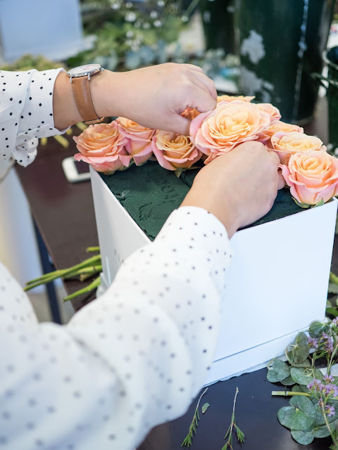 Ako prvé sme mali možnosť si vyskúšať tvorbu flower boxov zo živých kvetov. Ja som si zvolila na prvý pohľad jednoduché ruže. V konečnom dôsledku to však bolo oveľa náročnejšie, ako namiešať si rôzne kvety. Zachovať jednotnú líniu bolo nesmierne ťažké a až na záver som videla, že tých ruží som tam dala až príliš. Nevadí… dôležité je, že som ho tvorila pre moju Ninku a tá sa mu veeeeľmi potešila ♥