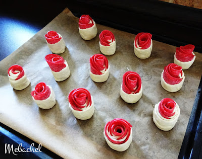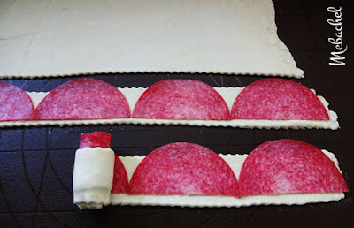 Lístkové cesto som rozvaľkala a nakrájala na asi cca 3 cm pásiky, na ktoré som poukladala salámu.