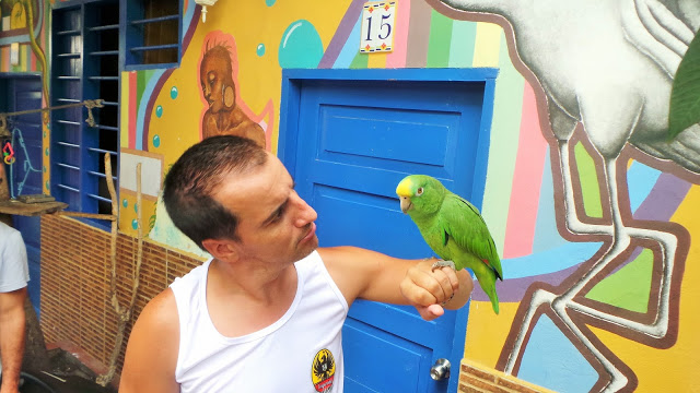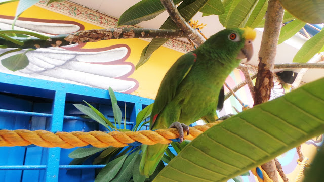 Na dvorku už posedává pár lidí – pokuřují cigaretky, popíjejí kafíčko a probouzejí se k životu – no bylo tu pěkně rušno celou noc – ten rambajz utichl až někdy ve čtyři ráno – ale když jste unavení, jste schopní spát při všem – a věřte, že jsme byli pekelně unavení! Jdu si pro snídošku zdarma – uf palačinky – zaseee… Tak za prvý arašídový máslo nemají (a slíbila jsem vám, že už přece nebudu 😀 ), za druhý javorovej sirup mi fakt nic neříká a za třetí mi palačinky vopravdu lezou ušima – no co se dá dělat – jídlo zdarma je jídlo zdarma – poděkuju, vezmu talířek a uvelebím se na jedné ze sedaček pod stromem, který svými zelenými větvemi zastiňuje půlku dvorku. Na jedné z nich opět sedí náš zelený papoušek, kterého před chvilkou majitelé vytáhli z klece – vesele se tam prochází a snaží na sebe upoutat pozornost hlučným monologem – někdy nás i rozesměje a pak legračně napodobí náš smích – smějeme se ještě víc a znovu a znovu – no pecka… takovej začarovanej smací kroužek 😀