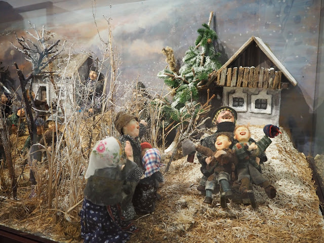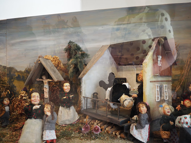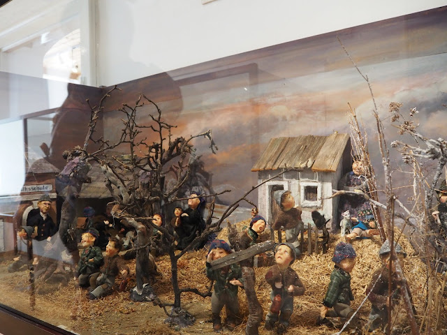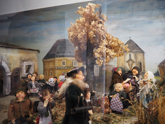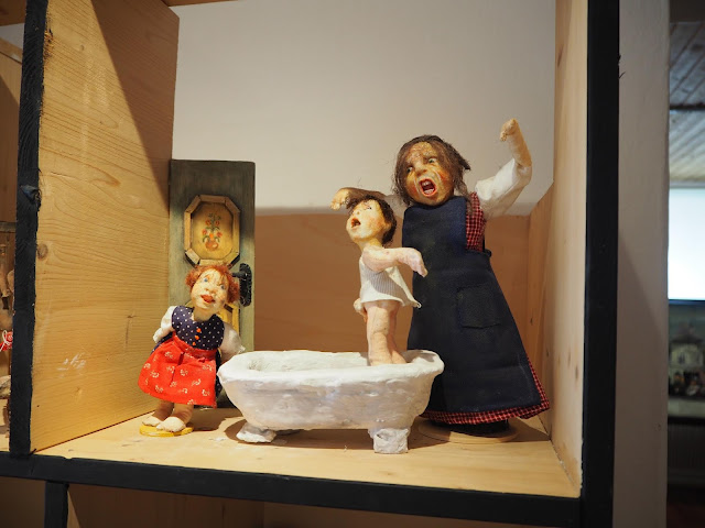… přes malý dvorek je muzeum panenek. Nejsou to ale panenky na hraní, ale panenky, které vyrábí paní a vyprávějí o životě, tradici a zvycích obyvatel Hüttenbergu. Zajímavé téma a věřím, že tamější život nebyl lehký, ale většina panenek, nebo spíše postav měly tak děsivé výrazy ve tvářích, že mi z toho nebylo hezky a utekla jsem …