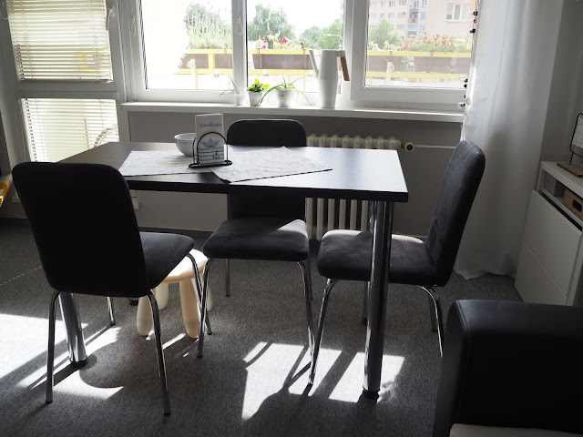 ... další důvod změny byl ten, že jídelní stůl byl doslova utopený v kuchyni pod oknem. Vešli se k němu pohodlně dva lidi, což bylo hodně nepraktické. Tady vejdou i čtyři, je ale možné, že ještě bude o něco větší deska stolu. Uvidíme, pokoj bohužel nafukovací není ...