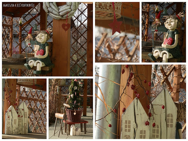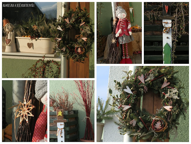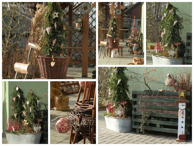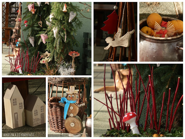 Některé jsem si pořídila letos. Smrkové stromečky do proutěného koše a plechové vaničky, šiškový věnec k terase a přírodní u vchodových dveří nebo jelínek jsou z naší domácí produkce. Sněhuláček u lavičky a „látkové“ baňky na proutěném kuželu jsem si přinesla z našeho školního jarmarku a dva dřevěné vysoké sněhuláky u dřevěných květináčů jsem si koupila u jedné šikuly na Fleru.