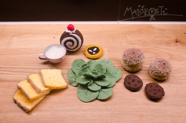 No a pak pečivo, které Madlence dost chybělo. Toastový chleba jsem odkoukala z jakéhosi dětského DIY pořadu v televizi, ale trošku jsem si ho po svém vytunila. Materiál je houbička na nádobí z DMka. Houska na hamburger je rovněž z houbičky, z takové kulaté. Měla pěkný tvar a sama o sobě by se už dala použít celá, leč byl by to hambáč v životní velikosti, což ostatní potraviny nejsou, takže jsem nakonec z jedné houby udělala více minihoustiček a tvar musela doupravit nůžkami. Protože houbička byla žlutá, což se mi moc nelíbilo, natřela jsem ji Balakrylem (je stínovaná odstínem tmavě hnědé a bílé). Aby byl hamburger úplný, ušila jsem do něj ještě maso.