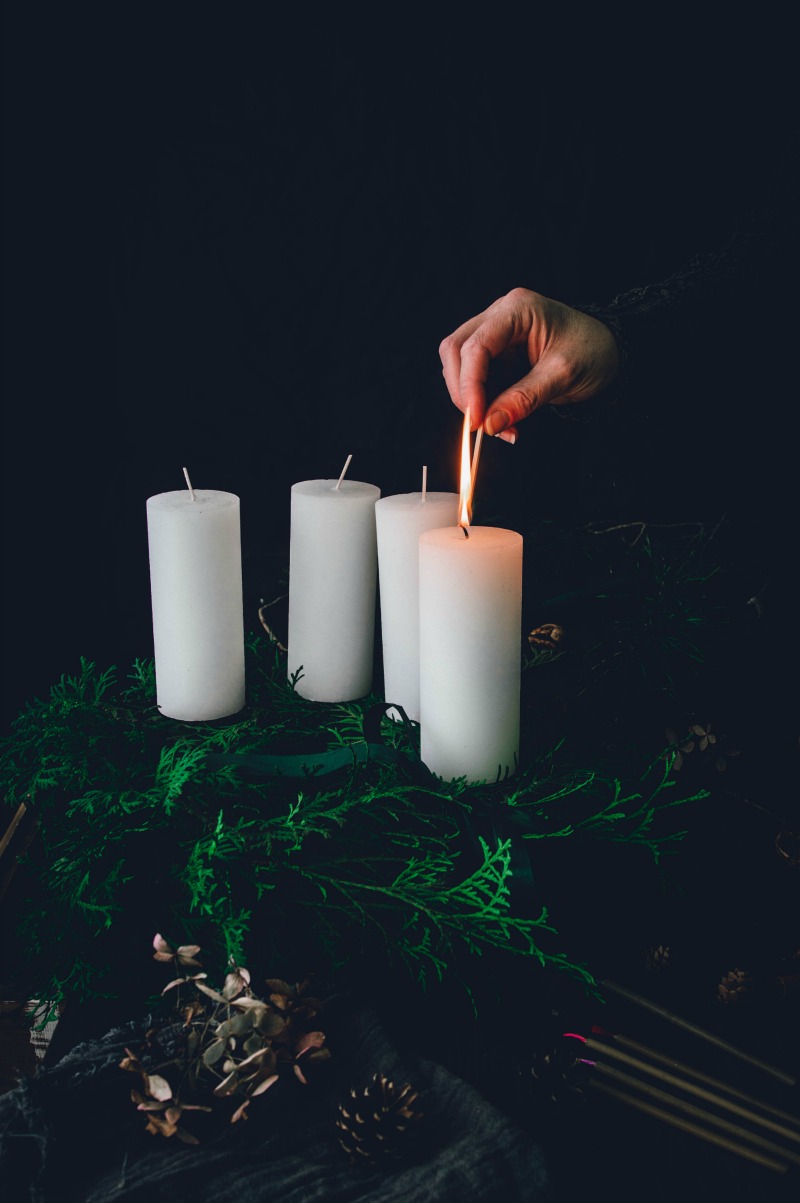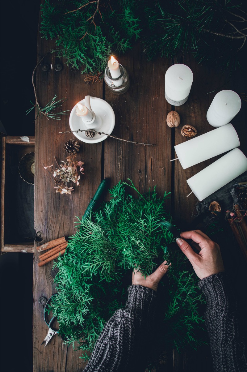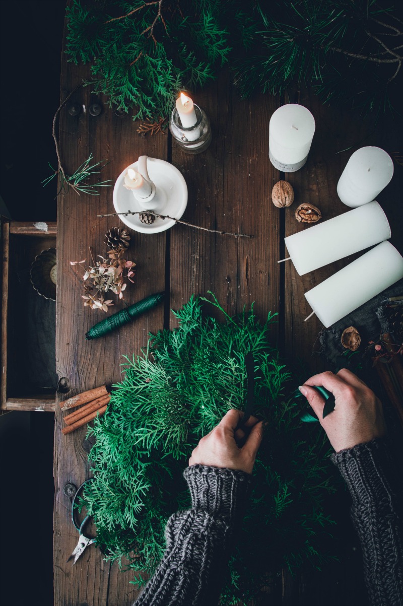 Jednou z prvních vánočních aktivit je výroba adventního věnce a věnečku na naše vchodové dveře. Při tom začínám pouštět první vánoční písničky a rozsvítím spoustu svíček. V posledních letech se snažím využívat jen přírodní materiály, jako větvičky nebo šišky.
