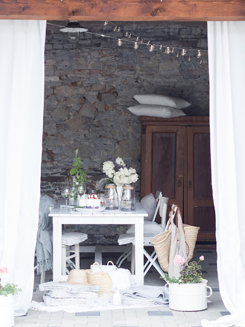 Sme späť z dovolenky a užívame si takéto nádherné večery. Musím priznať, že dovolenkovať s dvomi malými deťmi nám dalo zabrať a na konci týždňa sme sa s manželom aj tešili domov 🙂 Teším sa aj, že počasie je stále teplé, letné a večer, keď už deti spia si môžeme s manželom užiť chvíľku vonku na terase. Túto sezónu som ju trochu pomenila. Žiadalo sa nám pridať biele závesy a hlavne milé svetielka, ktoré som objavila v Jysk.