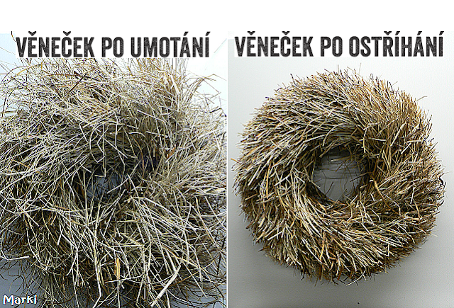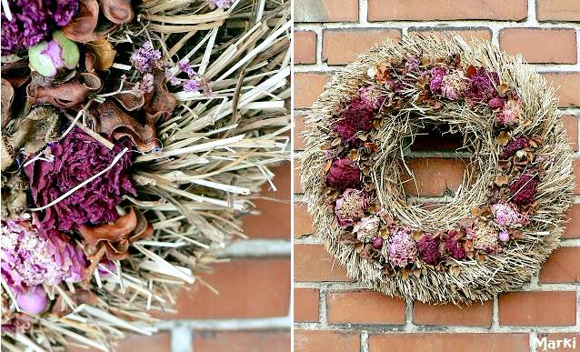 Po ostříhání nastupuje fáze, která mě baví nejvíce a to zdobení. Používám klasickou tavnou pistoli. Libuji si v přírodních materiálech, které sbírám všude kolem. Ani tento věneček není výjimkou. Jako základ mi posloužily uschlé dochany, a protože už jich nebylo moc, smíchala jsem je nastříhanými listy oschlých kosatců, díky tomu dostal věneček nazlátlou a načervenalou barvu. Dozdobila jsem ho sušenými pivoňkami, bukvicemi a zbytky červené vánoční směsi potpourri.