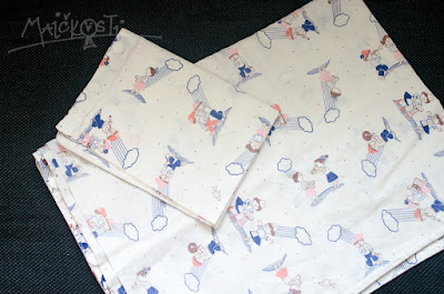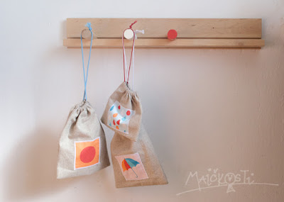 Na jejich výrobu jsem opět použila zbytkový materiál z jiného tvoření – základ je z plátna, které jsme měli na svatbě na stolech jako ubrusy a mám ho doma desítky metrů. Obrázek (samozřejmě by tam nemusel být, ale takhle mi to prostě dělá větší radost!) je z odstřižků z Madlenčiny hrací deky. Byla to celkem rychlovka, nemusela jsem dělat ani tunýlek v horní části, protože ten už tam byl (je to dvakrát zahnutý okraj ubrusu), takže stačilo jenom vhodně nastříhat, obentlovat okraje a sešít je k sobě, protáhnout gumičku a voalááá! Možná bych tam ještě mohla přidat plastovou „zarážku“ s pružinkou, ale zatím to nebylo potřeba, gumička po utažení drží na místě. Pytlíků mám zatím osm, ve dvou velikostech: 20,5×17,5 a 15,5×13,5cm a za pár dnů se chystám do města je poprvé testovat. Snad splní účel a budou mě blažit. A kdybych je náhodou nevytížila na sto procent, mohla bych třeba do některého z nich Madle koupit cvrnkací kuličky. Nebo spíš manželovi? 😉