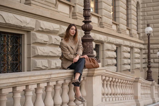 Vintage blazer and denim (cosmickids.cz), cashmere vintage turtlenech, leather trousers (Vinted), Massimo Dutti loafers