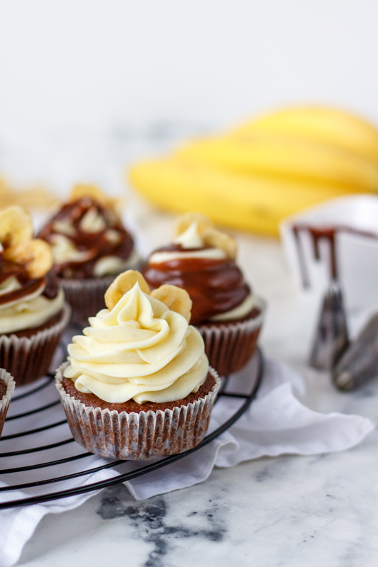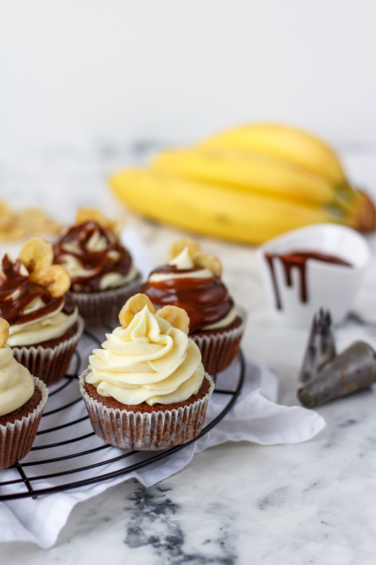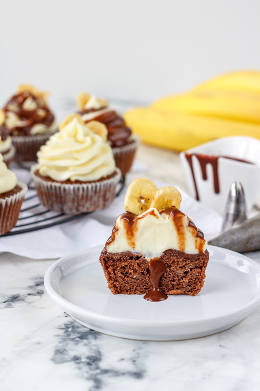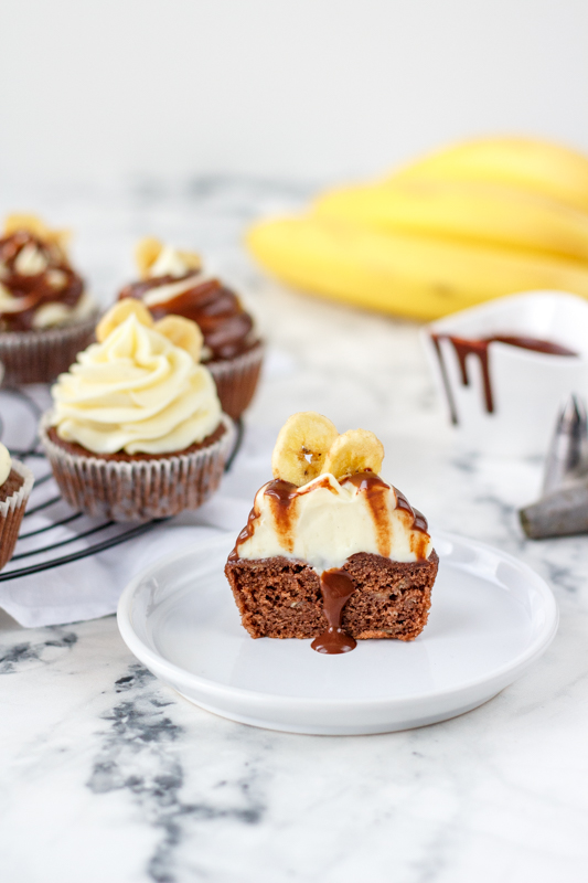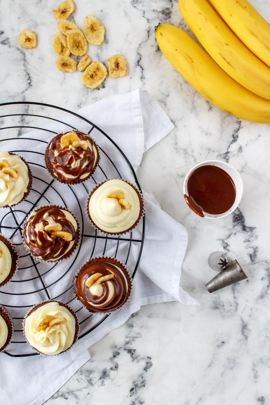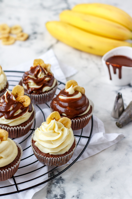 Doprostřed cupcakes udělejte malou dírku (já jsem si pomohla zdobící špičkou) a naplňte ji čokoládovou ganache. Krémem naplňte cukrářský sáček se zdobící špičkou, řezanou nebo kulatou, a ozdobně ho nastříkejte na cupcakes. Polijte je zbylou čokoládou a nahoru zapíchněte sušený banán.