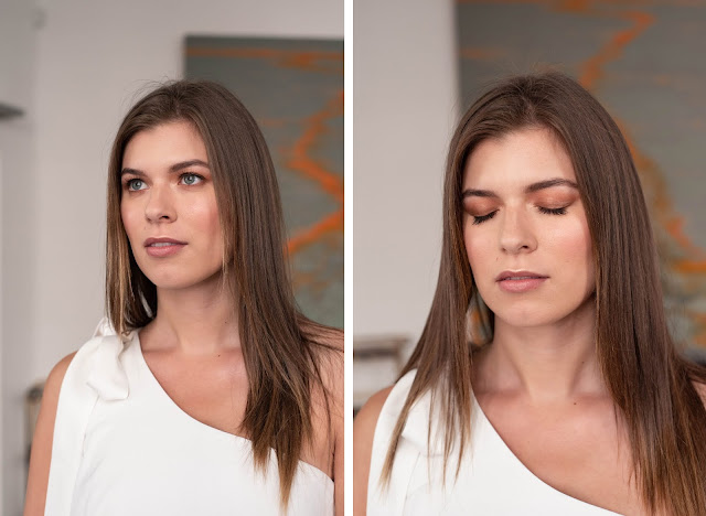Tohle je výsledné líčení, které nám Ester ukazovala během kurzu na modelce. Co vždy sedí každému, jsou teplé odstíny, i přesto, že máte třeba studený podtón pleti jako já. Teplé hřejivé barvy působí jemněji, žensky a dodají obličeji svěžest. Jak políbení sluníčkem. Takže i přesto, že máte studený tón pleti, nebojte se po teplejších odstínech sáhnout. Probudí a projasní vás.