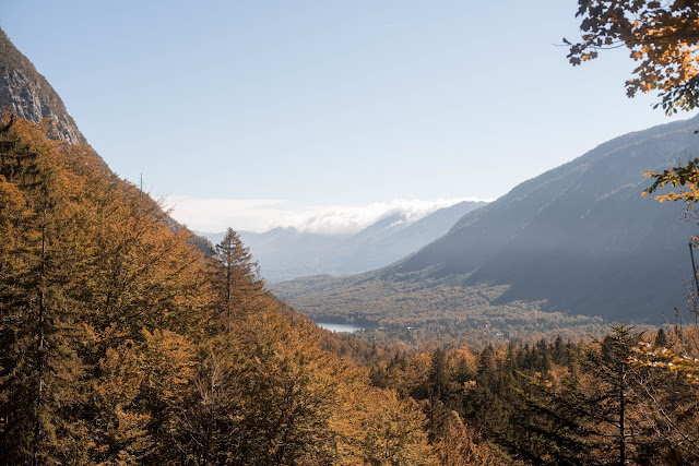 Druhé ráno jsem chtěl vstát na východ slunce a zažít bledské jezero pod oparem, ale nebyla jsem schopná vstát. Nachlazení mě dostávalo čím dál víc. Nakonec jsem se vyhrabala alespoň na snídani a byla jsem ráda, že jsem si zabalila věci na výšlap. Vypravili jsme se totiž na tůru na Vyševník, 2050 metrů vysoká hora v Julském pohoří. Není to tak turisticky exponovaná trasa, jako jiné, které vedou přímo pod Triglav, nejvyšší horu Slovinska. Výšlap na Vyševník není nijak extra náročný, dá zabrat, o tom žádná, když je na podzim mokrá zem, tak se nevyhnete ani kluzkému bahnu, ale všechno se to dalo zvládnout. Většinu trasy jsme měli krásné výhledy, ten zasloužený nás čekal ale až na samotném vrcholu, protože máte výhled do všech stran. A hlavně na Triglav, který se před váma zjev jak na dlani. Lidí tu s nám bylo akorát. Dokonce byl i prostor udělat si pár fotek na památku. Nahoře celkem fouká, tak se na to vybavte. Vyševník jsme si sešli druhou stranou, než jsme přicházeli a měla jsem celkem respekt, protože byla vysypaná celá drobným kamením a štěrkem. Nic pro povahy, které s lezením po horách nemají moc zkušeností, noha vám sklouzne ani nevíte. Naštěstí jsme si to postupně sešli bez nehody, načepovali horskou vodu a pokračovali zpět k autu. Mezitím se nám otevřeli podzimní výhledy do údolí. Tenhle výšlap rozhodně doporučuju.