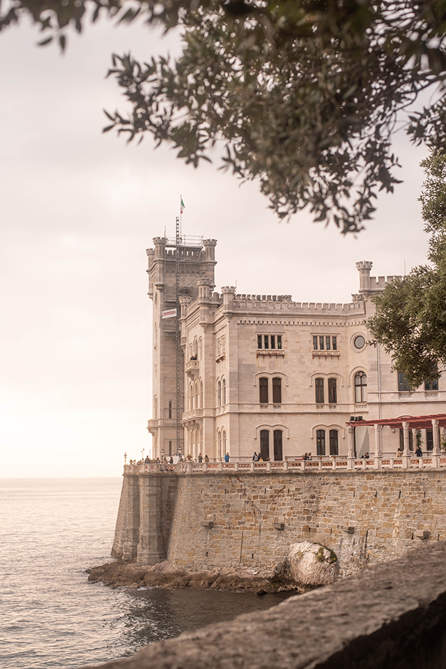 Tam jsme nakonec měli i namířeno, chtěli jsme si udělat zastávku v Trieste, kde jsem předtím nikdy nebyla. Než jsme přijeli do centra, nešlo neminout zámek Miramare na břehu moře, jako vystřižený ve stylu Windsoru nebo naší Hluboké. Krásné romantické místo. Zrovna jsme to tu stihli před západem slunce. Bývala to kdysi letní residence Habsburků. Zámek obklopují velké zahrady, olivovníkové háje a altány plné růží a květin. Jestli někdy uvažujete o svatbě u moře, koukněte na tohle pohádkové místo...