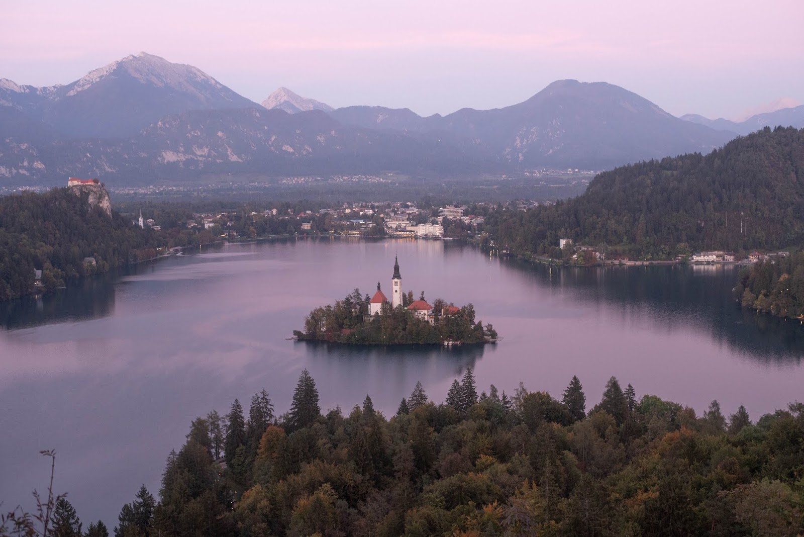 Ten den už jsme se akorát vydali na procházku k jezeru a Insta vyhlídku nad ním, odkud máte ten známý výhled na ostrůvek s kostelem, kam se dá doplavit i loďkou, ale tentokrát jsme to vynechali. Zůstali jsme až do západu slunce, bylo to tu navečer magické. Po setmění jsme se procházeli u pobřeží jezera a měli nad hlavami nebe poseté hvězdami, kde v dálce svítilo hradní světlo jako z majáku.