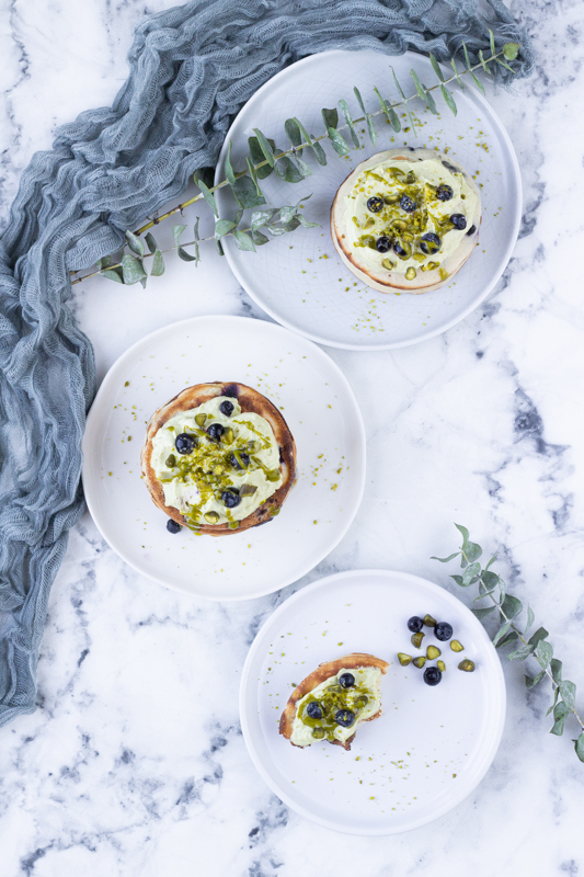 Hotové lívanečky zdobíme krémem, borůvkami a kousky pistácií.