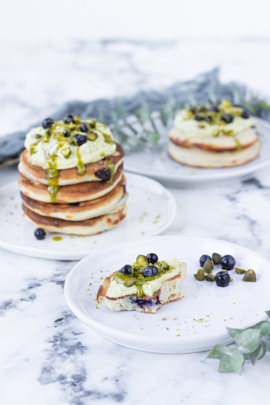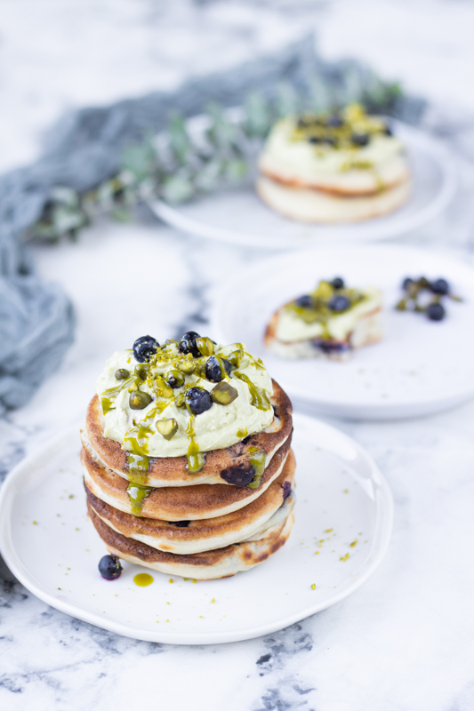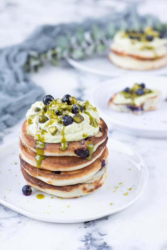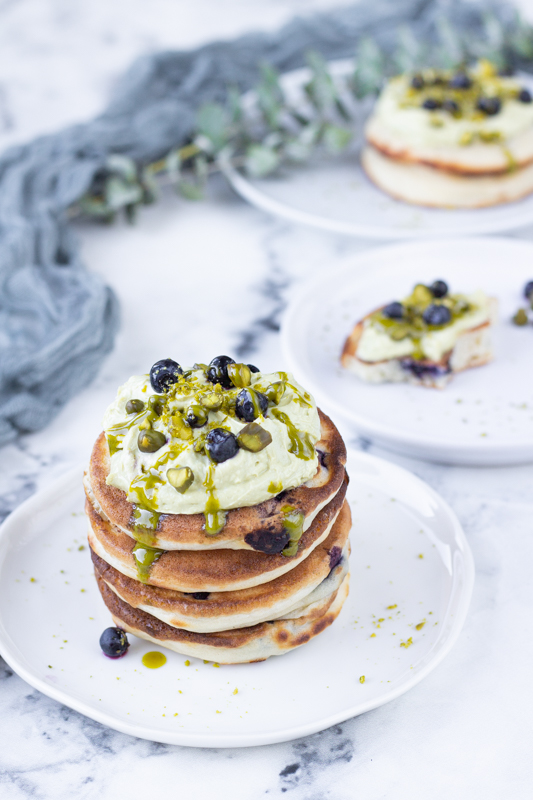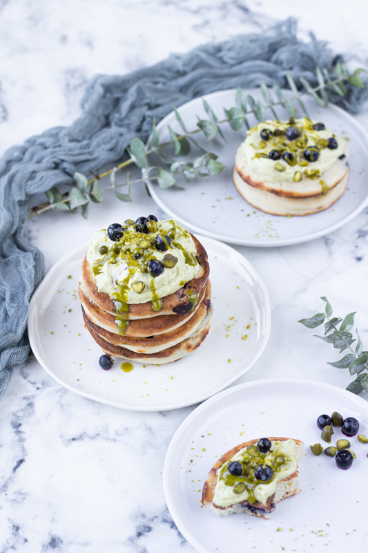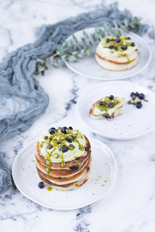 Poprvé jsem zkusila do těsta na lívance přidat nějaké ovoce a byl to rozhodně dobrý nápad. Z Jeseníků jsem si minulý víkend dovezla borůvky nasbírané přímo v lese, moc jich sice nebylo, protože víc jsme trhali do pusy než do kelímku, ale i tak nebylo nad čím váhat. K lívanečkům to tentokrát chtělo něco lepšího než marmeládu, ušlehala jsem jednoduchý krém ze zbytku mascarpone, tvarohu a trochy smetany (to aby byl lehký a nadýchaný) a přidala pistáciové máslo. Zelená a modrá k sobě totiž báječně ladí, nemyslíte?
