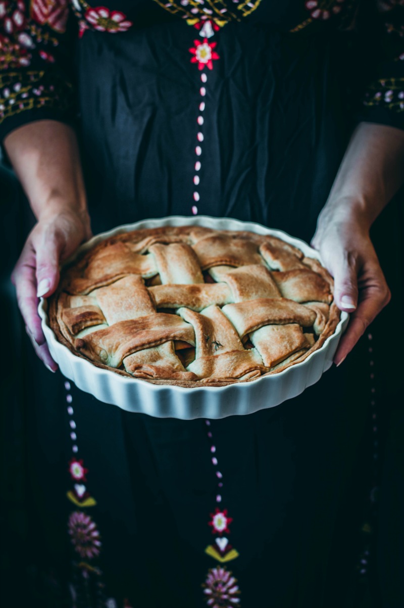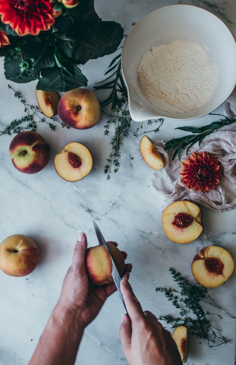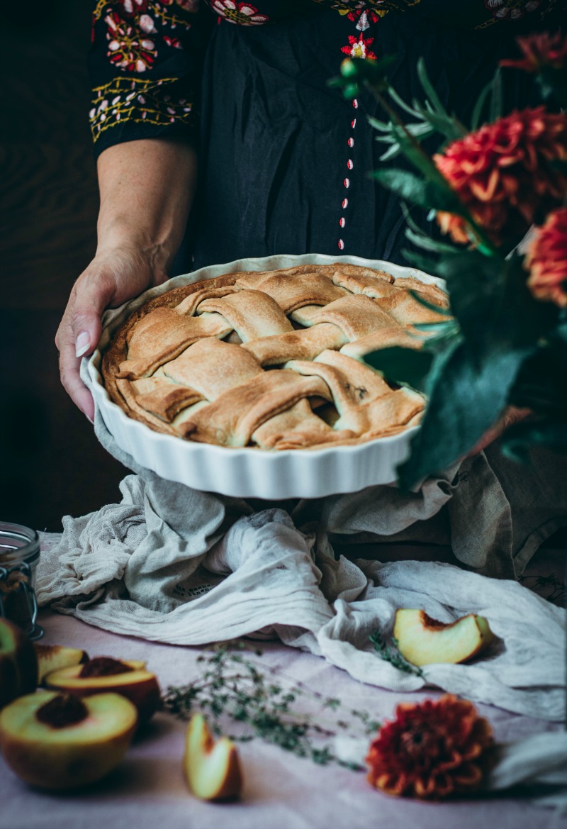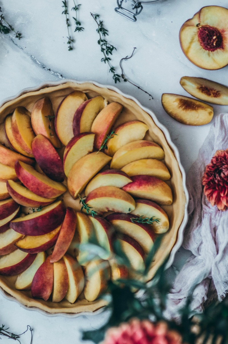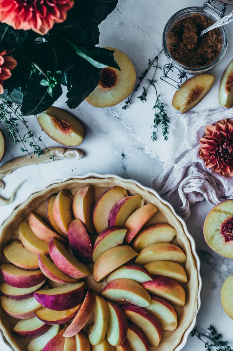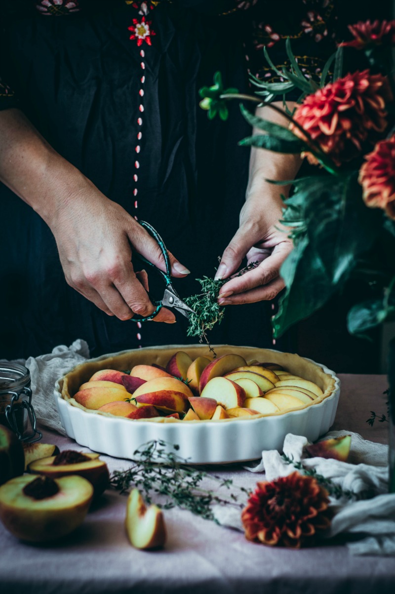 A spojení tymiánu s broskvemi je prostě dokonalé. Především pokud použijete čerstvý tymián ze zahrádky. Část jsem použila přímo do náplně k broskvím a další jsem přidala do vanilkové omáčky, kterou jsem se tentokrát rozhodla koláč doplnit. Byl to risk, ale omáčka má po tymiánu zajímavý kouřový nádech (a určitě ji nedělám v této kombinaci naposledy).