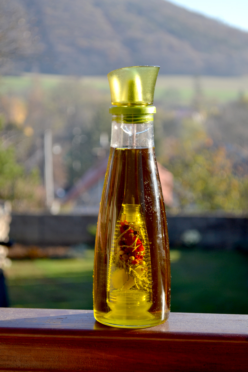 Môžete pridať aj nejakú bylinku na ozdobu, tá by však mala byť vysušená, ktorá nezhnedne ako čerstvá. Ja som použila vetvičku rozmarínu. Dôležité je aby všetko bolo úplne ponorené v oleji. Veľmi sa mi na toto osvedčila nádoba na olej od Tescomy, ktorej súčasťou je lúhovacie sitko, do ktorého som povkladala všetky ingrediencie a vložila do oleja. Je to veľmi praktické, pretože ich kedykoľvek môžem z oleja pohodlne vybrať. Fľašu mám po ruke na kuchynskej linke, vyzerá to dobre a je to aj celkom pekná dekorácia.