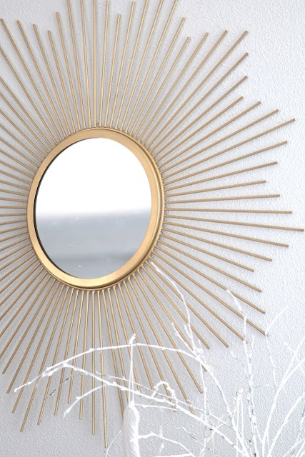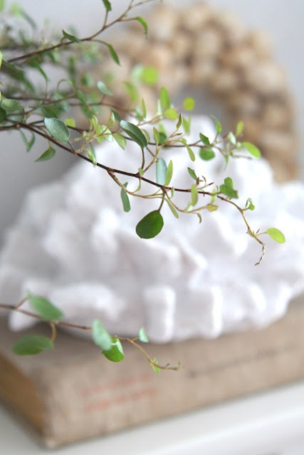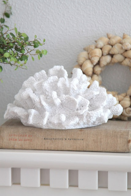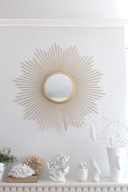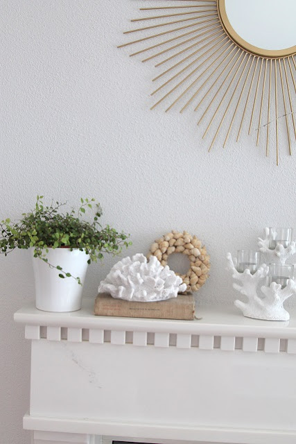 V obývačke zatiaľ stále vládne svieža prímorská atmosféra, len zrkadlo nad krbom má už svoju plánovanú zlatú farbu a na krb pribudol nový biely koral, venček z mušličiek a muehlenbeckia z Ikey.