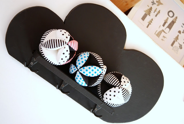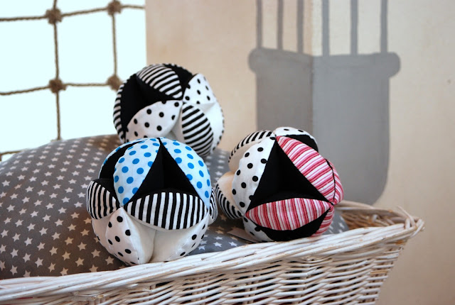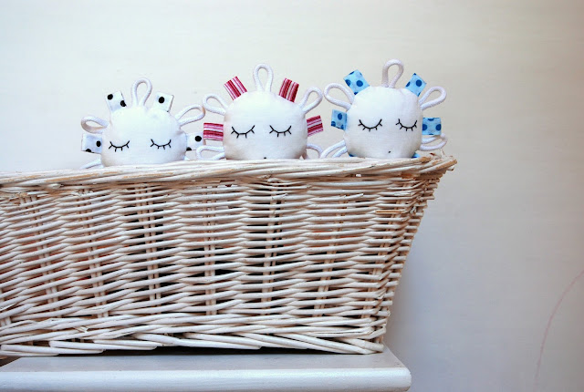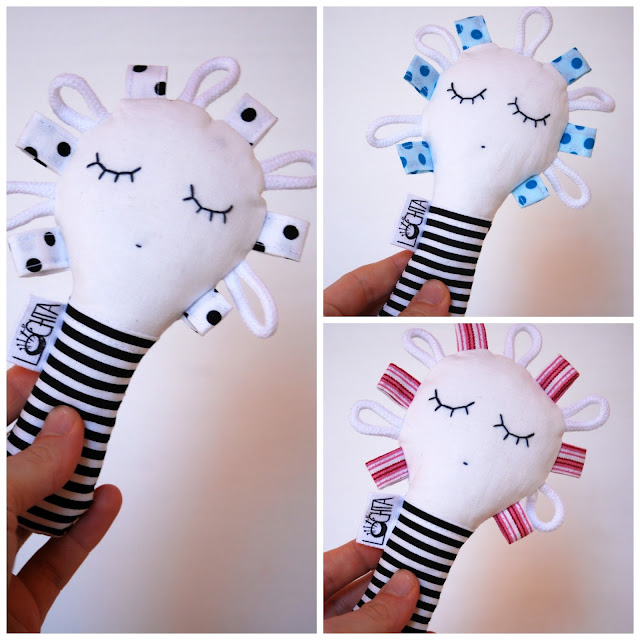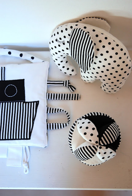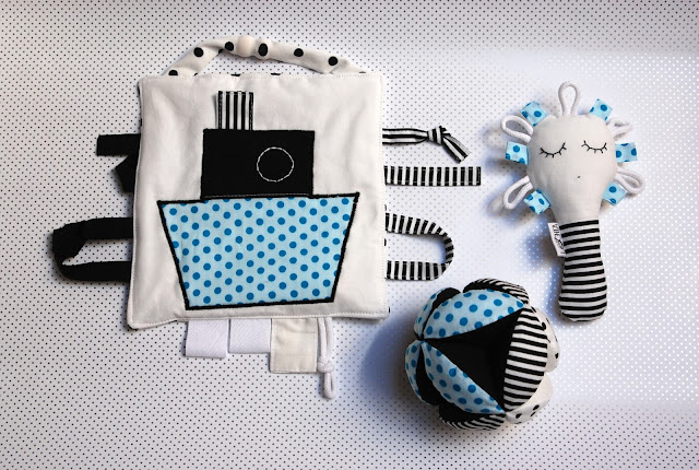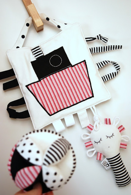 Černobílé sady hraček pořád budou, k tomu si občas pro radost ušiju nějakou tuhle krapetbarevnou variantu pro oživení. Aby to víc bavilo mě i vás..