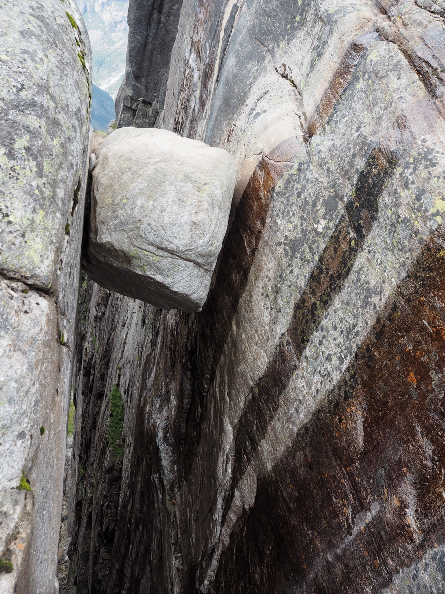 Myslela jsem si totiž – a doopravdy nevím, jak jsem na to přišla – že Kjeragbolten je jenom optickej klam. Že pod tím šutrem je normálně zem a ta propast a vejška je až jakoby dál. A že když posunute objektiv výš, aby nebyla vidět ta zem, tak to vypadá, že stojíte přímo nad propastí…