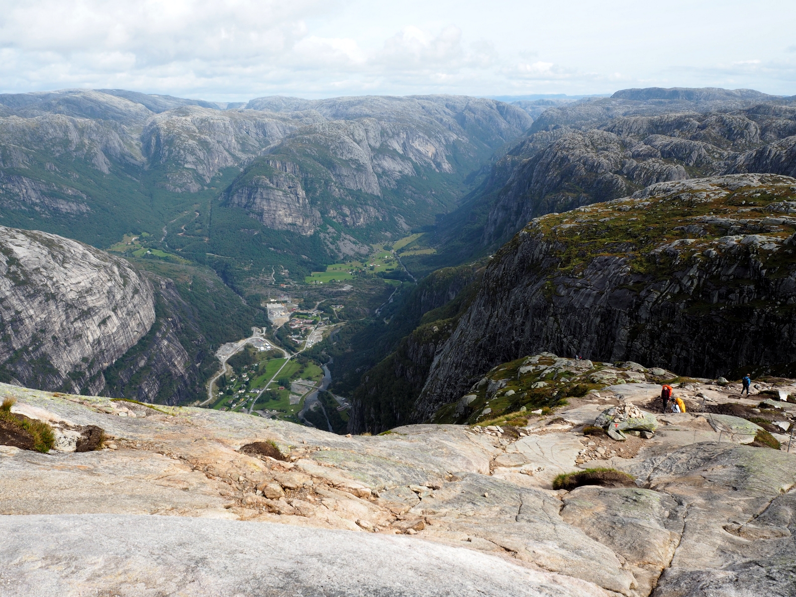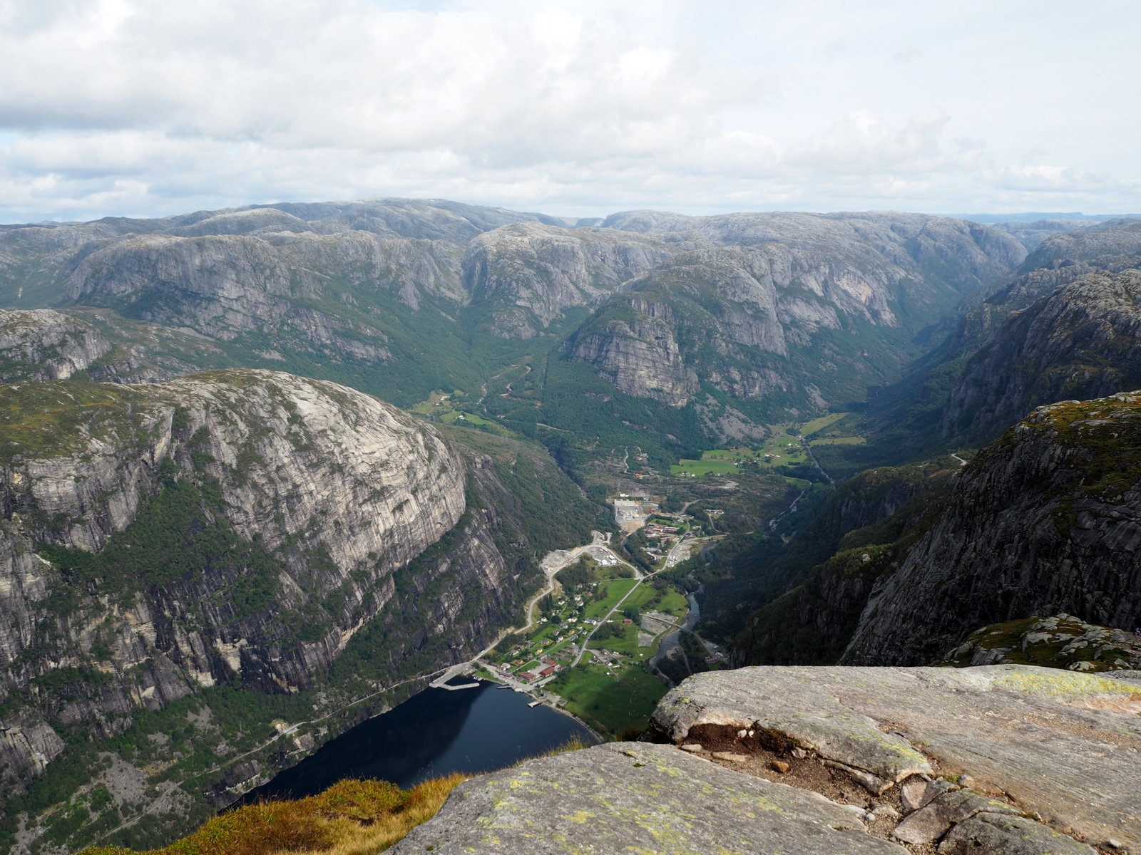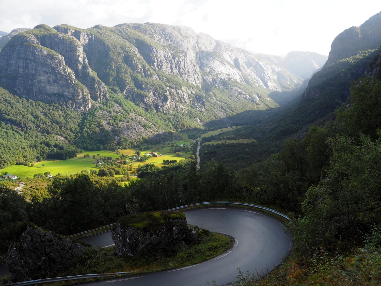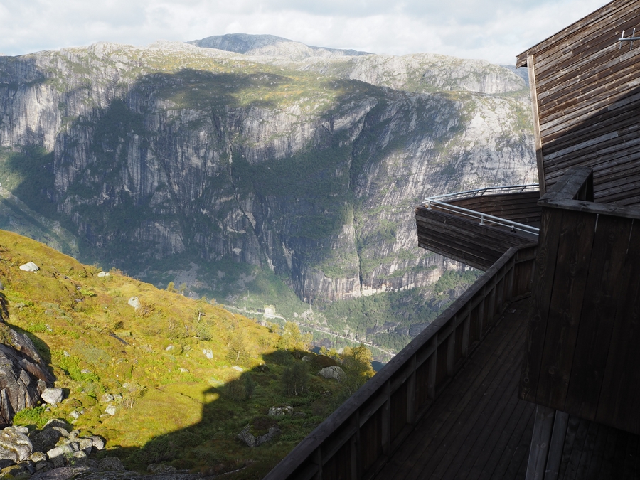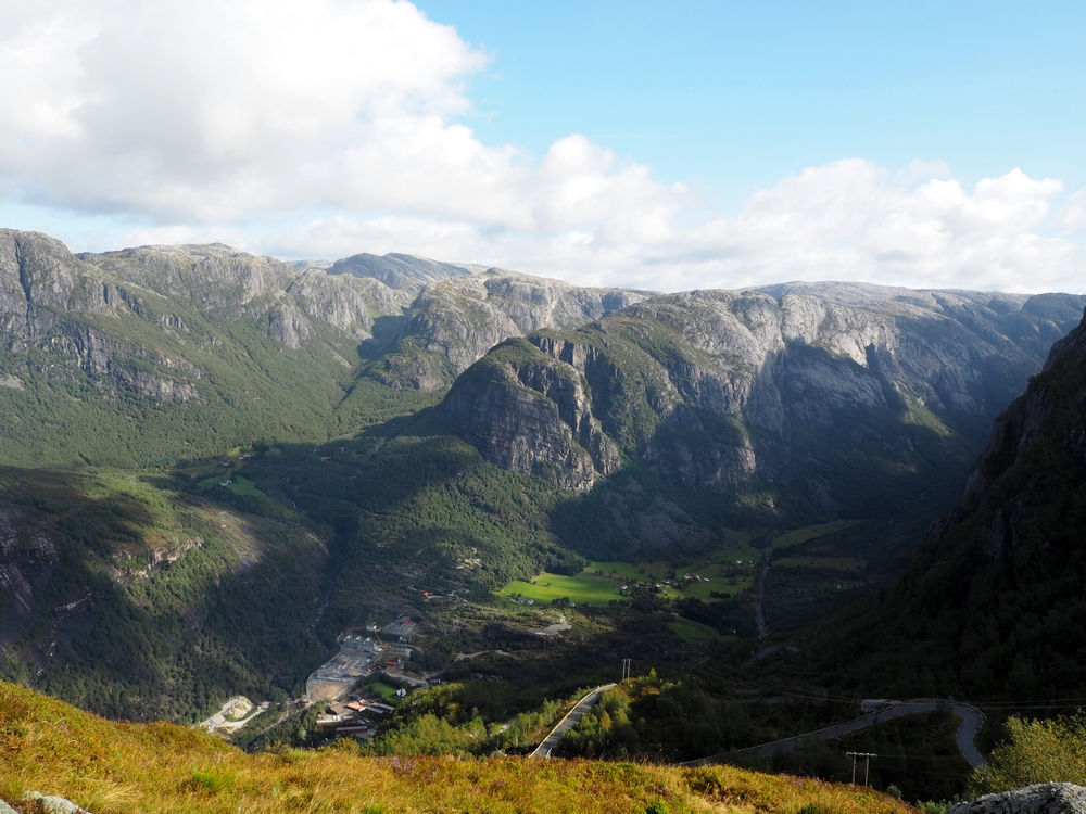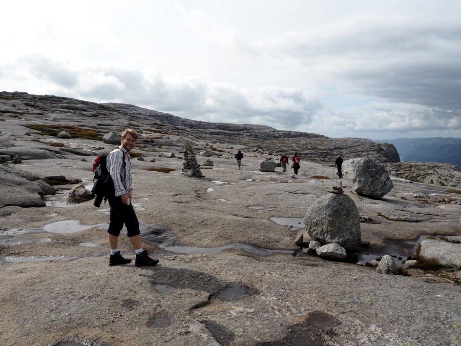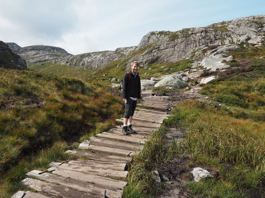 Vedle Preikestolenu je to jeden z nejznámějších přírodních úkazů a turistických cílů na jihu Norska (A s Trolltungou obecně v celém Norsku – je o dost severněji). Nejlépe se na něj dostanete z Lysebotnu. Když přijedete trajektem k přístavu a půjdete cestou podél silnice víc do vnitrozemí, dojdete po necelém kilometru k odbočce, která vede na parkoviště. Tohle parkoviště je výchozí bod na trek ke Kjeragboltenu a je od přístavu vzdáleno asi 6 kilometrů, přičemž převýšení je – nevím přesně kolik, ale 6 kilometrů jdete serpentinami prudce do kopce, takže si to dovedete představit… Čili pokud nejedete autem a nebo se vám nepodaří chytit si stop (nám se to tentokrát nepovedlo, protože jsme vyrazili brzo ráno a nikdo kolem nás skoro ani neprojel) musíte si to vyšlápnout prostě sami…
