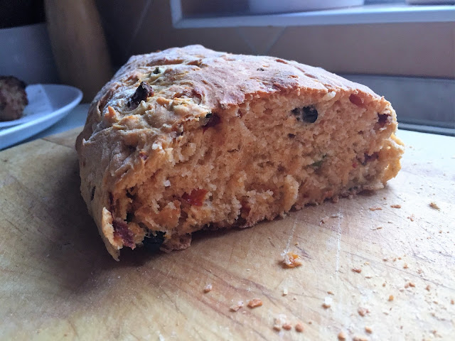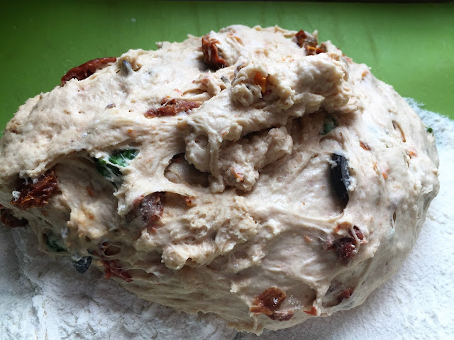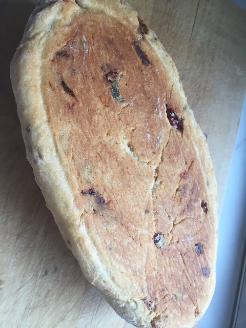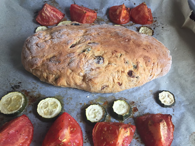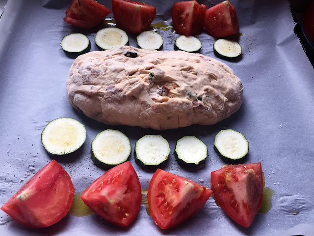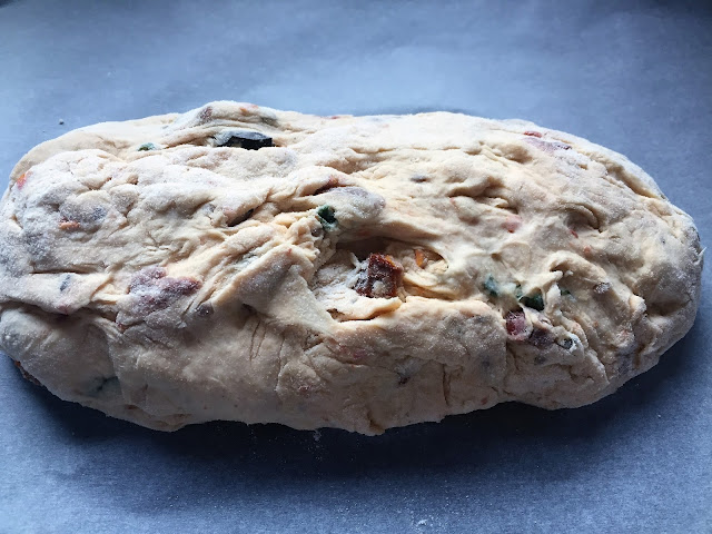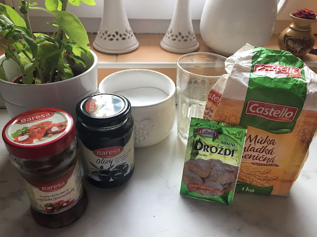 O proti původnímu receptu, jsem musela trochu improvizovat, protože jsem neměla doma droždí v kostce, ale droždí sušené, a také jsem neměla sušená rajčata, ale rajčata naložená v olivovém oleji. Rajčata jsem nechala okapat a poté nakájela na drobné kousky a jinak postupovala podle instrukcí. Těsto jsem nechala kynout na teplém místě a to poté, co jsem jej sama vypracovala, protože nemám domácí pekárnu.