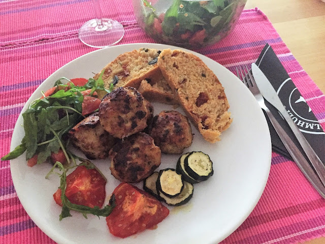 Jako třešničku na dortu jsem ke kuličkám a ciabattě udělala velmi oblíbený salát, který dělám poměrně často… je z rukoly, nadrobno nakrájených rajčat, špetky soli, pepře, olivového oleje a balsamiko octa, jedné snítky jarní cibulky a pár nakrájených lístků bazalky.