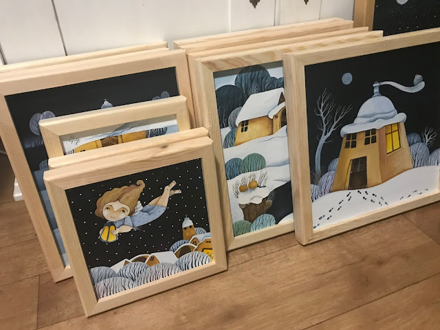 Výstava je samozřejmě na zimní téma a obrazy jsem, krom pár kousků, malovala komplet nové. A tak i když to vypadalo, že jsem celý říjen někde lelkovala, opak byl pravdou a v ateliéru se mi to kupilo…