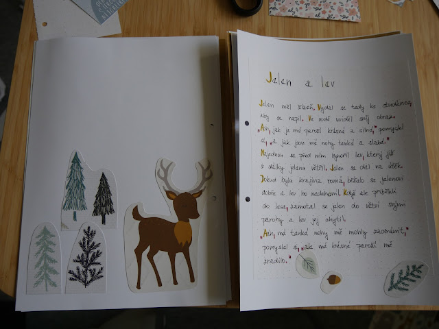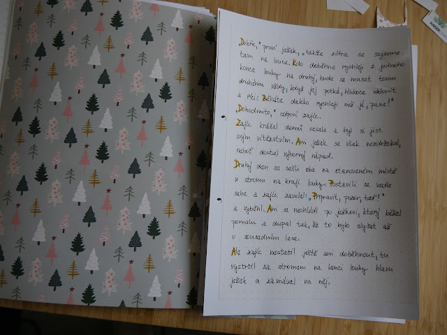 ... měli jsme ručně opsat dané bajky, k nim namalovat obrázky, vymyslet 6 hádanek nebo básniček a na závěr připojit další bajku - nejlépe vlastní tvorbu. S opsáním jsem problém neměla, to mi celkem jde. Trochu s malým "a", protože jsme museli dodržovat správný tvar písmen, aby je děti potom přečetli (malé "a" i v tiskací formě píšu psacím). S hádankami a další bajkou mi pomohl internet, ale namalovat nějaký obrázek, to ne, to neumím ...