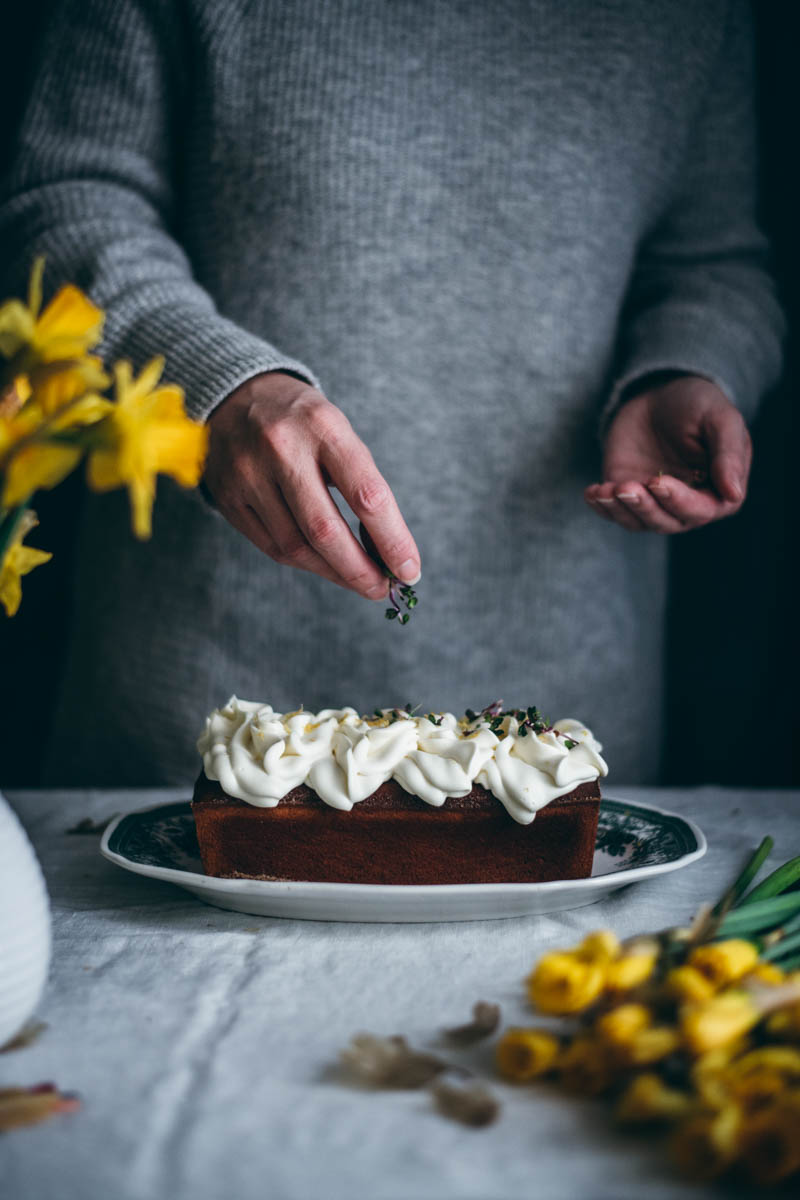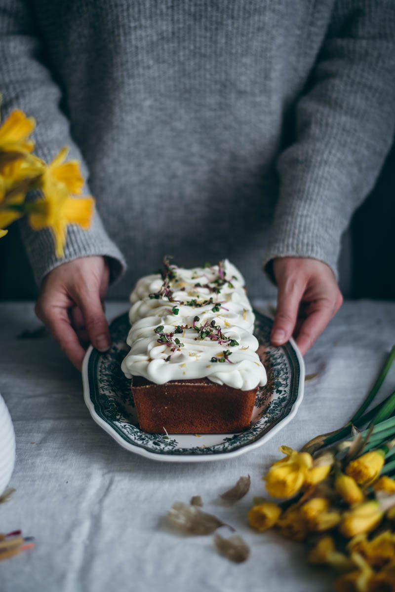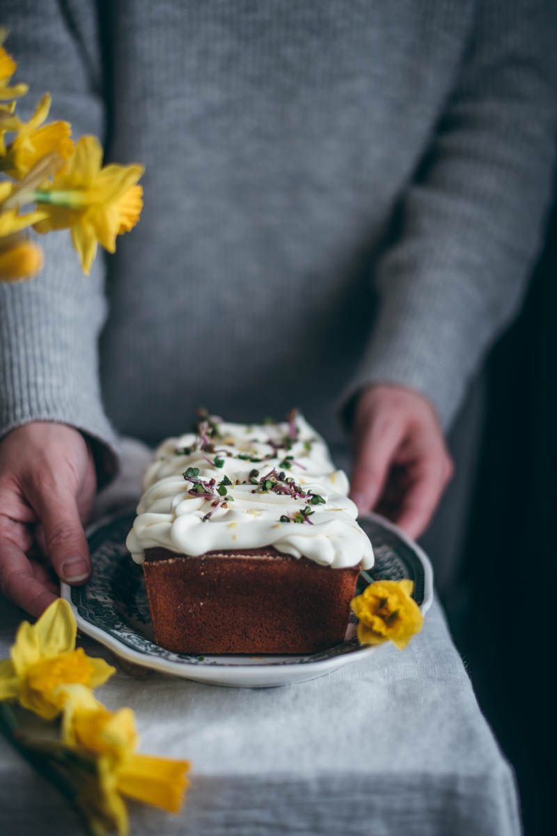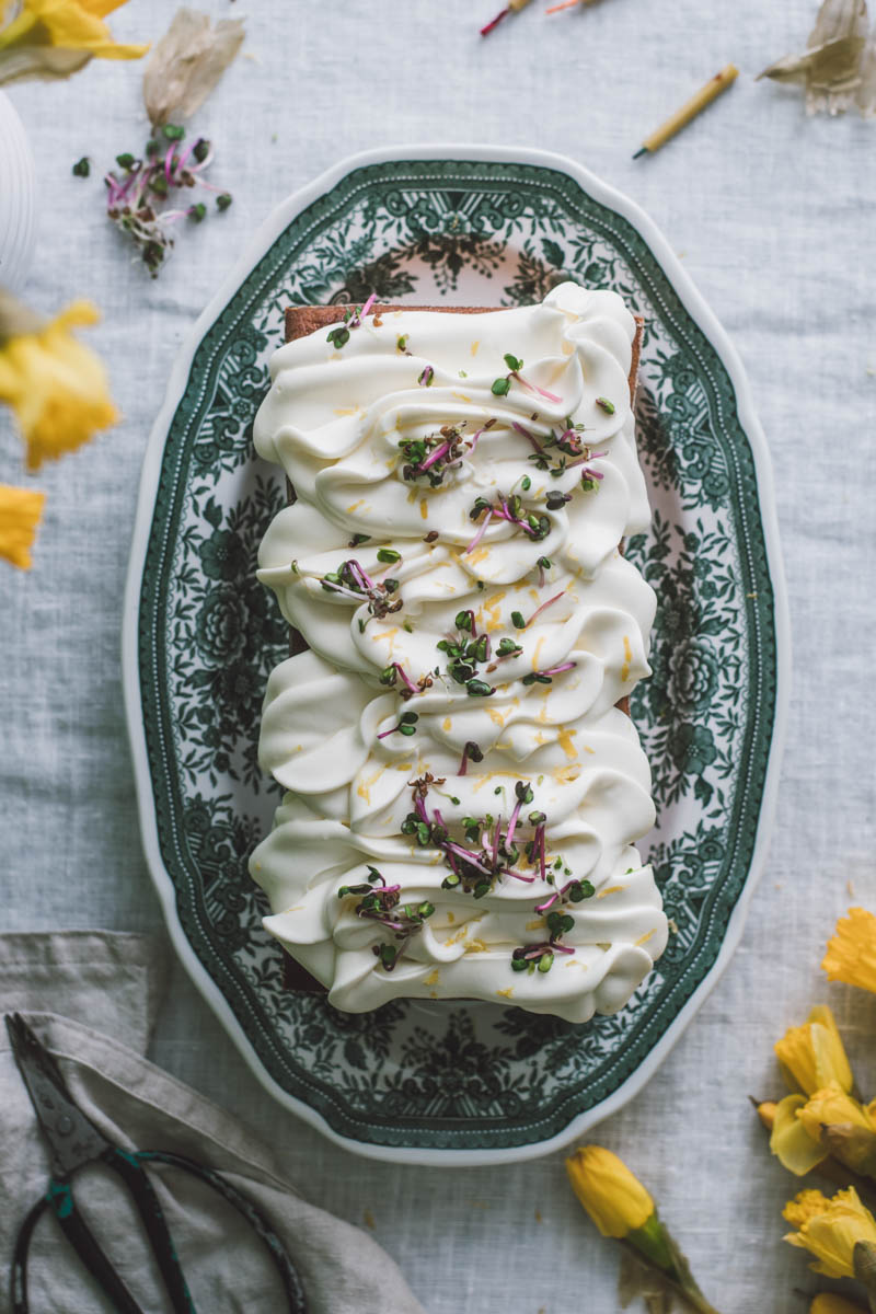 Jakmile bude chlebíček zcela vychladlý, nazdobíme jej krémem. Nakonec jsem chlebíček ozdobila nastrouhanou citronovou kůrou a čerstvými klíčky. Případně můžete použít čerstvé bylinky jako je tymián nebo rozmarýn.