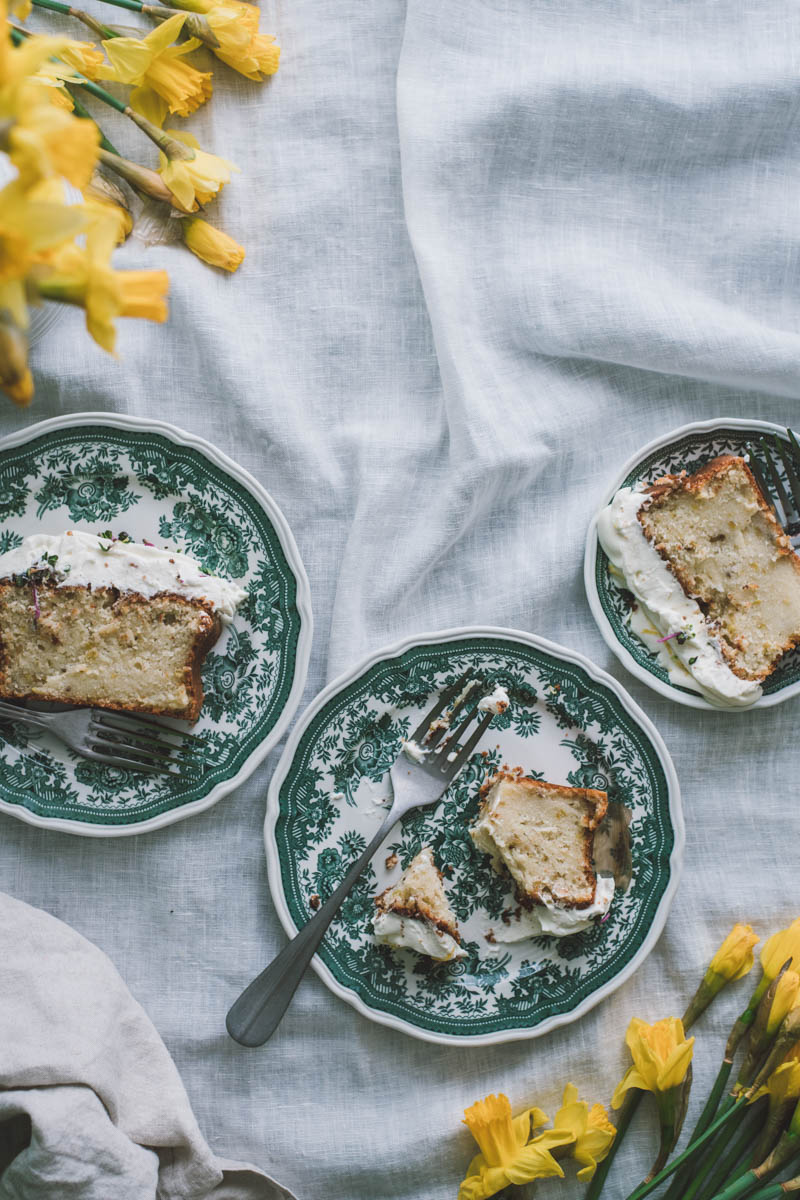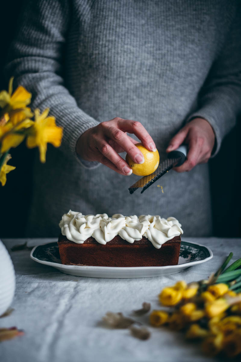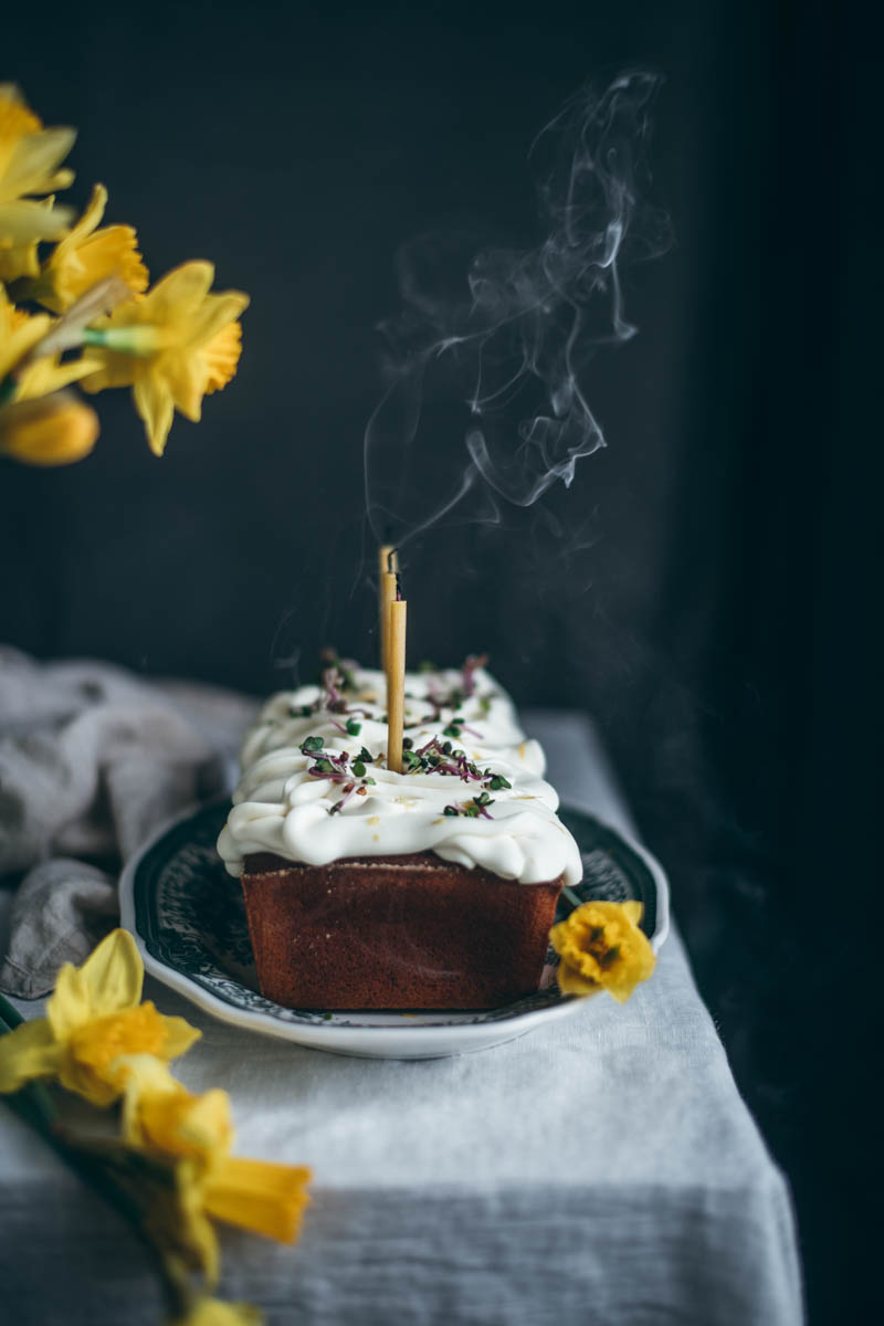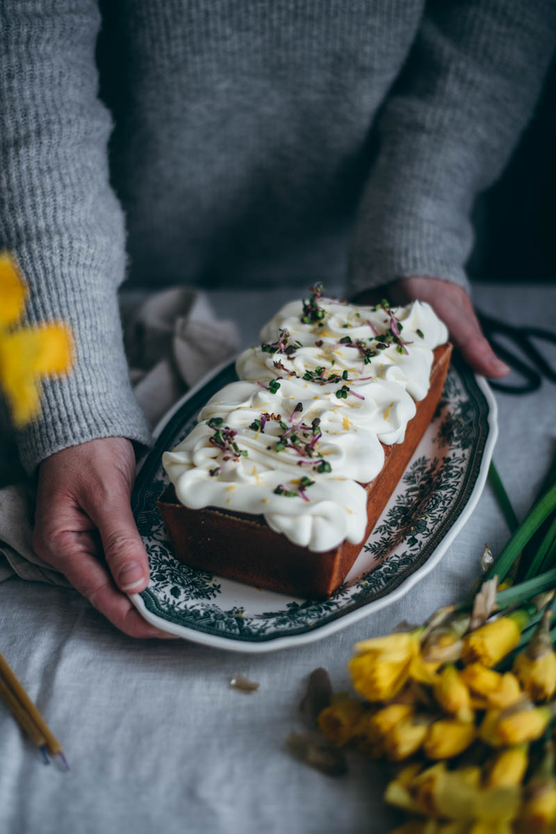 Jakmile bude chlebíček zcela vychladlý, nazdobíme jej krémem. Nakonec jsem chlebíček ozdobila nastrouhanou citronovou kůrou a čerstvými klíčky. Případně můžete použít čerstvé bylinky jako je tymián nebo rozmarýn.