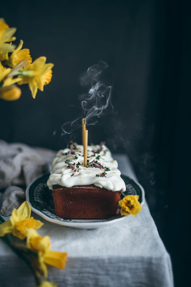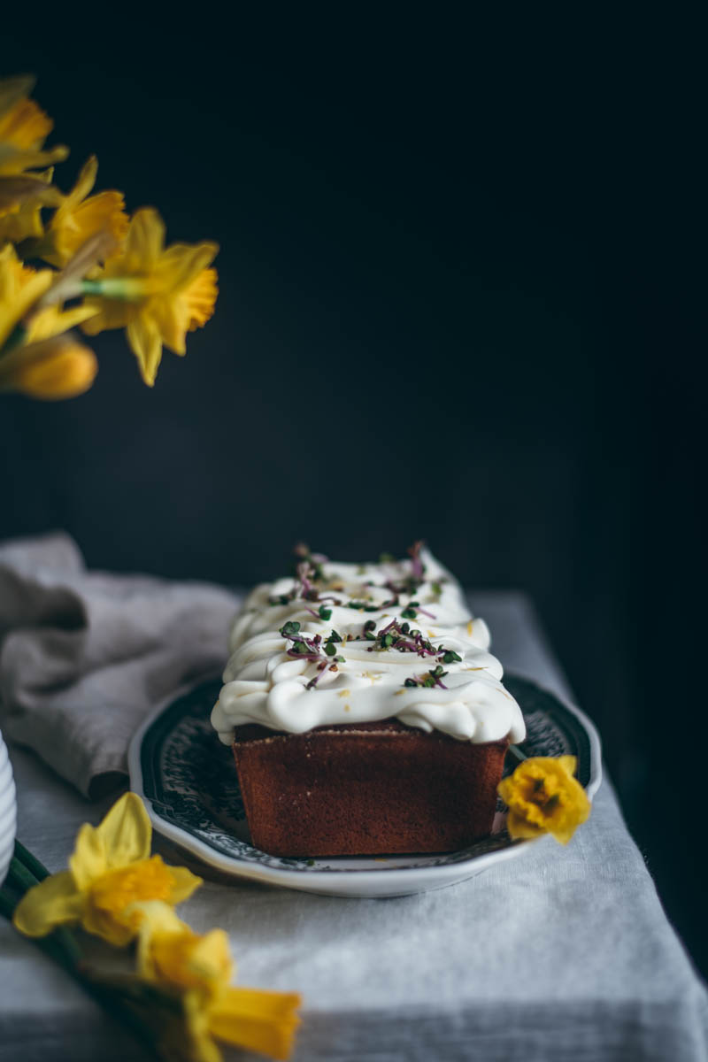 Jakmile bude chlebíček zcela vychladlý, nazdobíme jej krémem. Nakonec jsem chlebíček ozdobila nastrouhanou citronovou kůrou a čerstvými klíčky. Případně můžete použít čerstvé bylinky jako je tymián nebo rozmarýn.