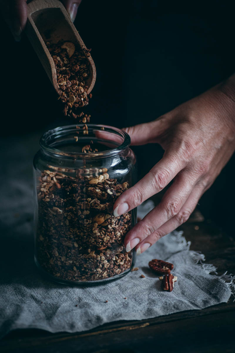 Granolu prostě musím mít po ruce vždy. Tvoří asi 90 % mých snídaní. Nejsem totiž po ránu vůbec kreativní člověk a v pracovním týdnu ji snídám v podstatě každý den. Je to takový rituál. S mlékem, jogurtem, ovocem… Receptů na granolu najdete na blogu několik, ale ta čokoládová mi tady chyběla.