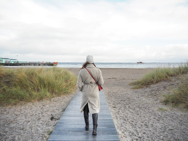Kousek od hotelu jsme měli tuhle boží pláž. V zimě trochu studenou a větrnou, ale umíte si to představit v létě… To si sem vezmete deku, vínko a pozorujete ty nejkouzelnější západy slunce. V zimě tu ale můžete vyzkoušet jinou pecku. Na tom molu v dálce jsou sauny s výhledem na moře. v dálce vidíte dokonce most do švédského Malmö. A když je vám horko, vlezete si rovnou do studeného (ledového) moře. Sen. Já bych to v té kose nedala, ale v létě bych sem šla rovnou z letiště.