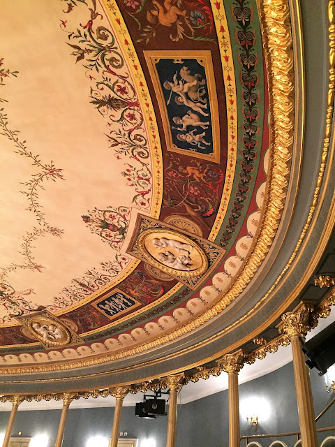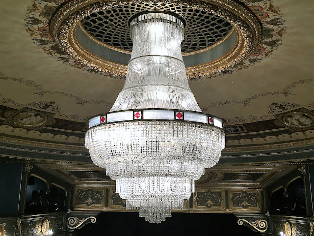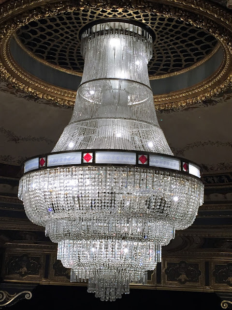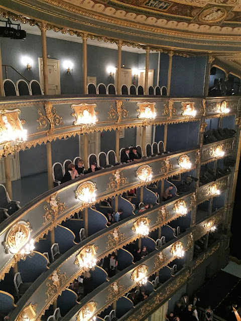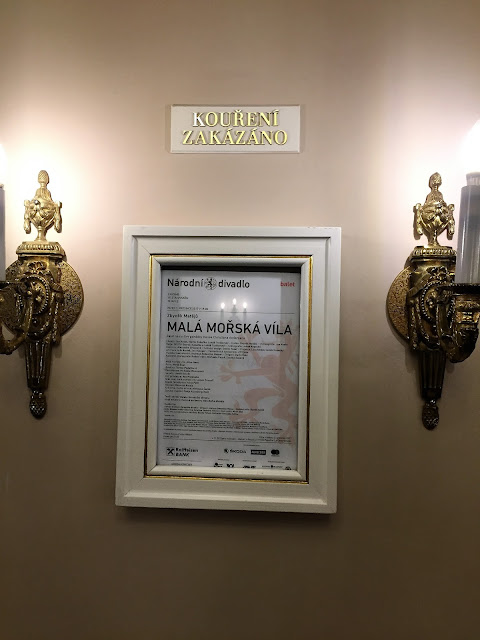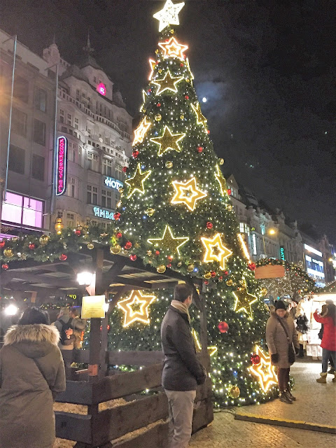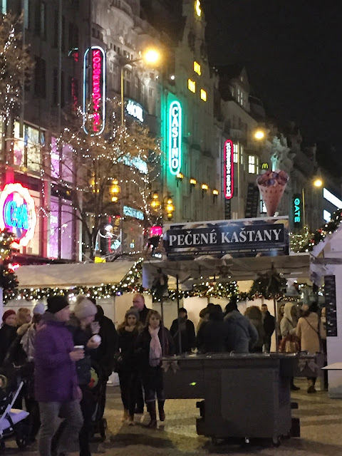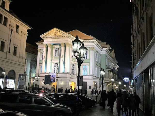 je jak jinak než divadelní a zároveň mile sváteční, podsvícené lucernami a nasvíceným vánočním stromem a Stavovským divadlem.