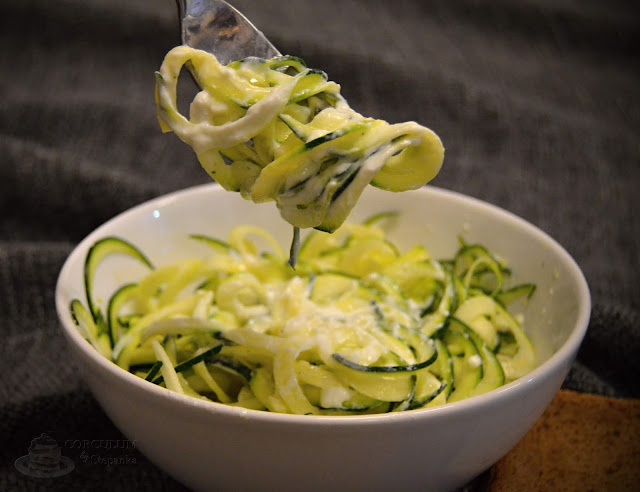 Cuketku omyjeme a nakrájíme/vytvoříme nudličky na spiralizéru. Naservírujeme do misky, přidáme pár lžic řeckého jogurtu, olivový olej a posypeme kořením.