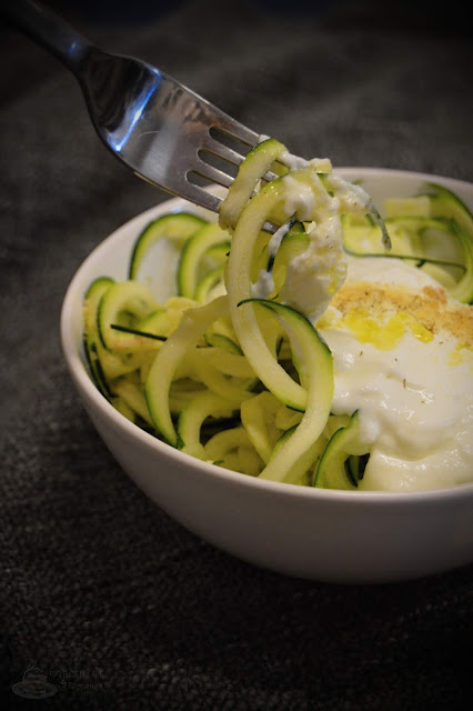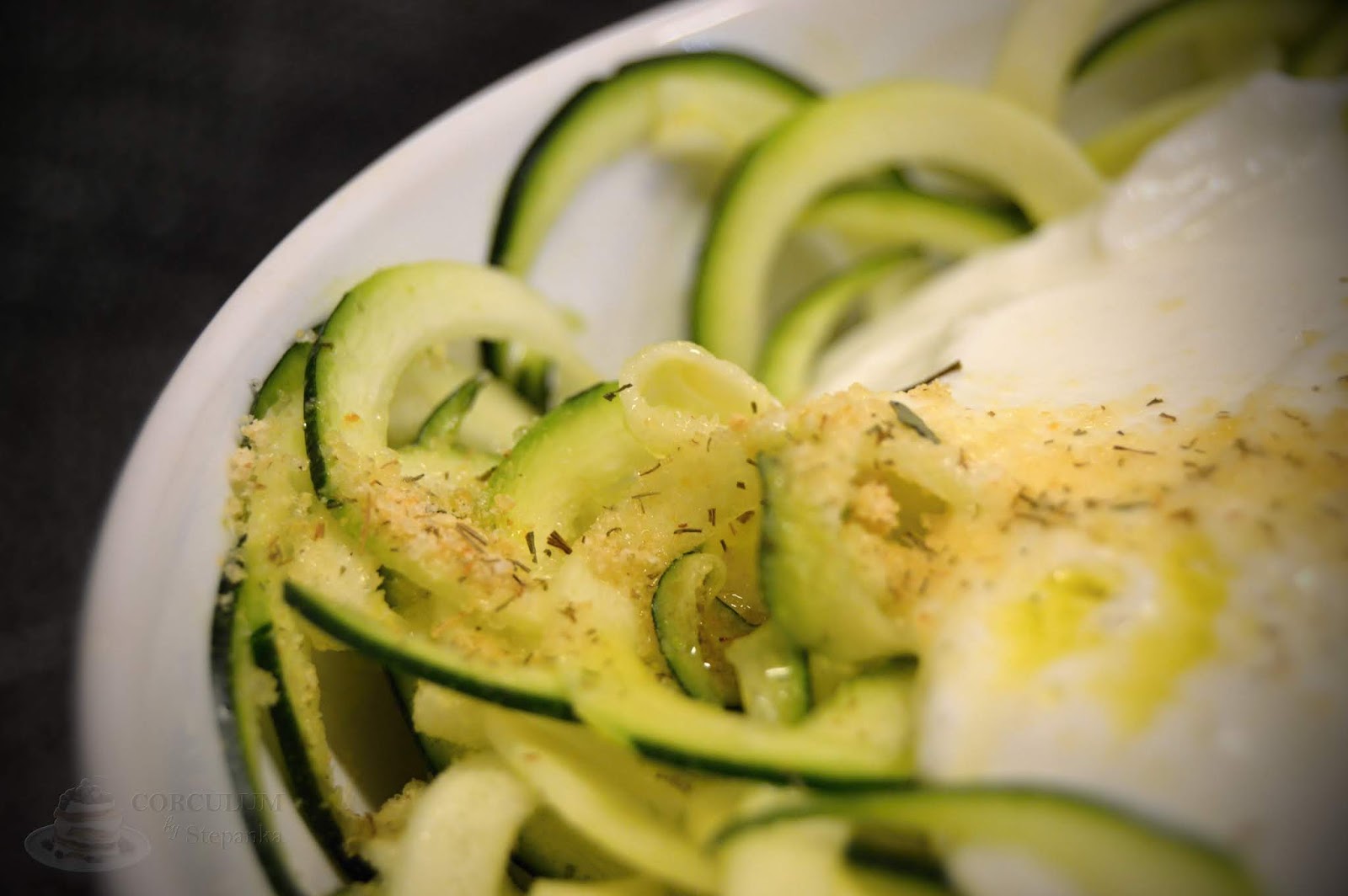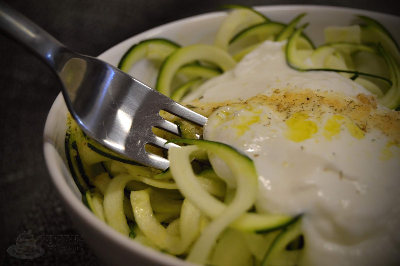 Cuketku omyjeme a nakrájíme/vytvoříme nudličky na spiralizéru. Naservírujeme do misky, přidáme pár lžic řeckého jogurtu, olivový olej a posypeme kořením.