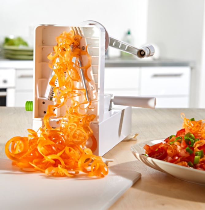 Nedoporučuji nic, z čeho vás bude příliš bolet ruka. 🙂 Např. spiralizér ala ořezávátko jsem musela po první okurce rovnou hodit do koše. Pokud nechcete někoho jen pořádně naštvat, darujte mu pod stromeček přístroj pořádný, s břity z ocele a s praktickou kličkou.