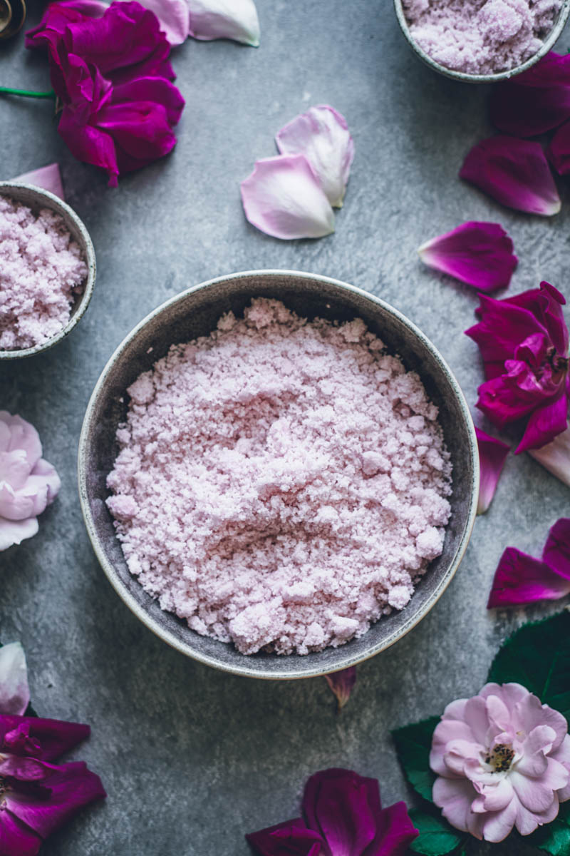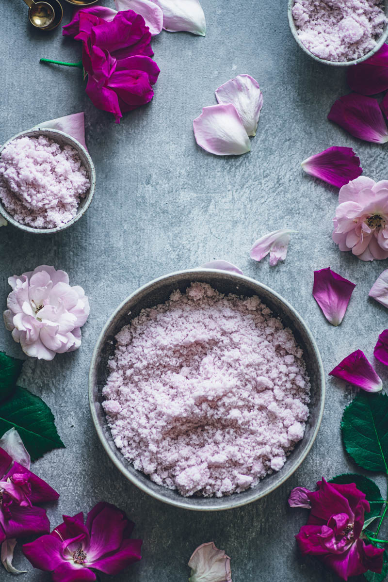 Cukr i okvětní lístky navrstvíme střídavě do foodprocesoru nebo výkonnějšího mixeru. Mixujeme, dokud se všechny okvětní lístky nerozemelou a cukr nezíská růžovou barvu.