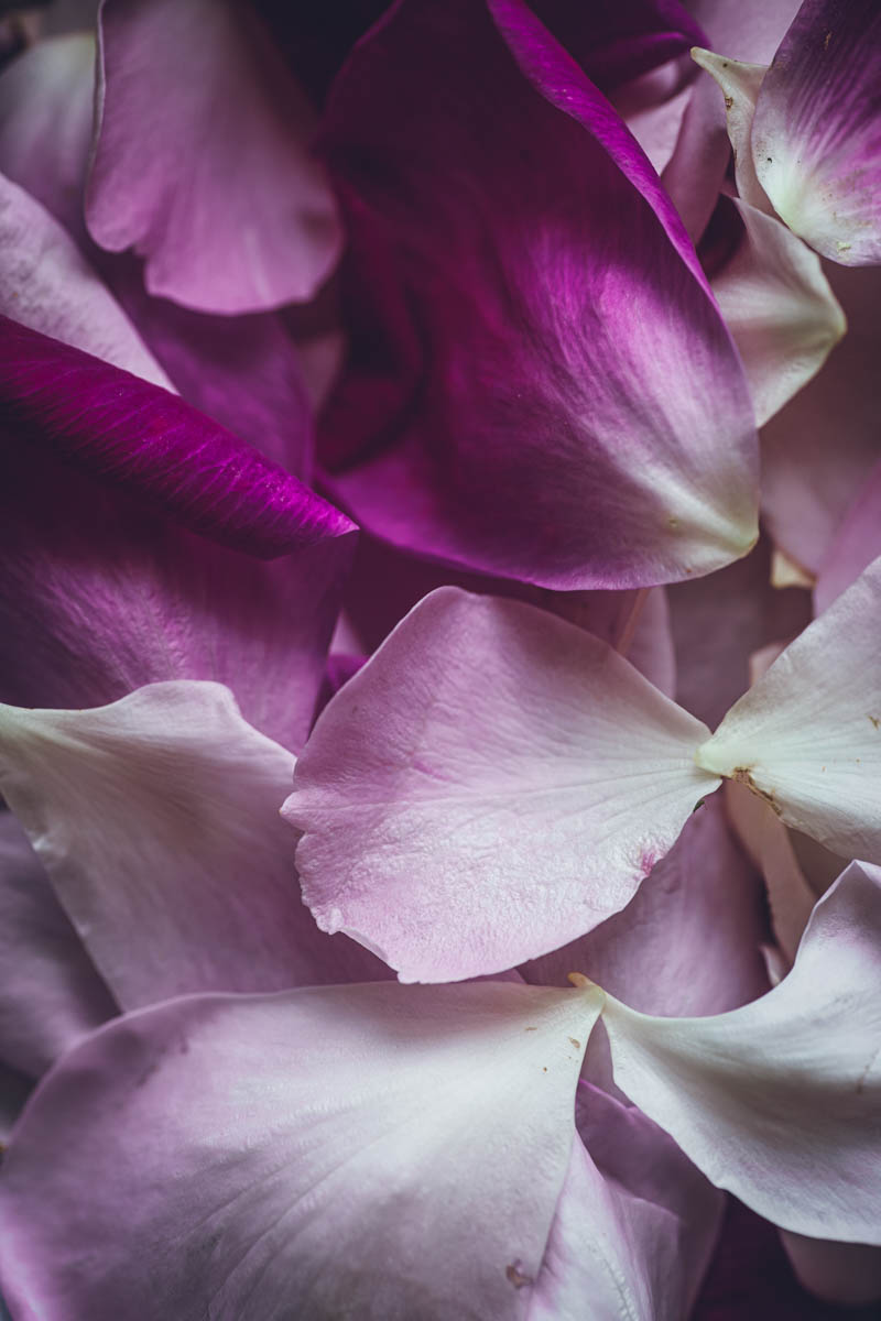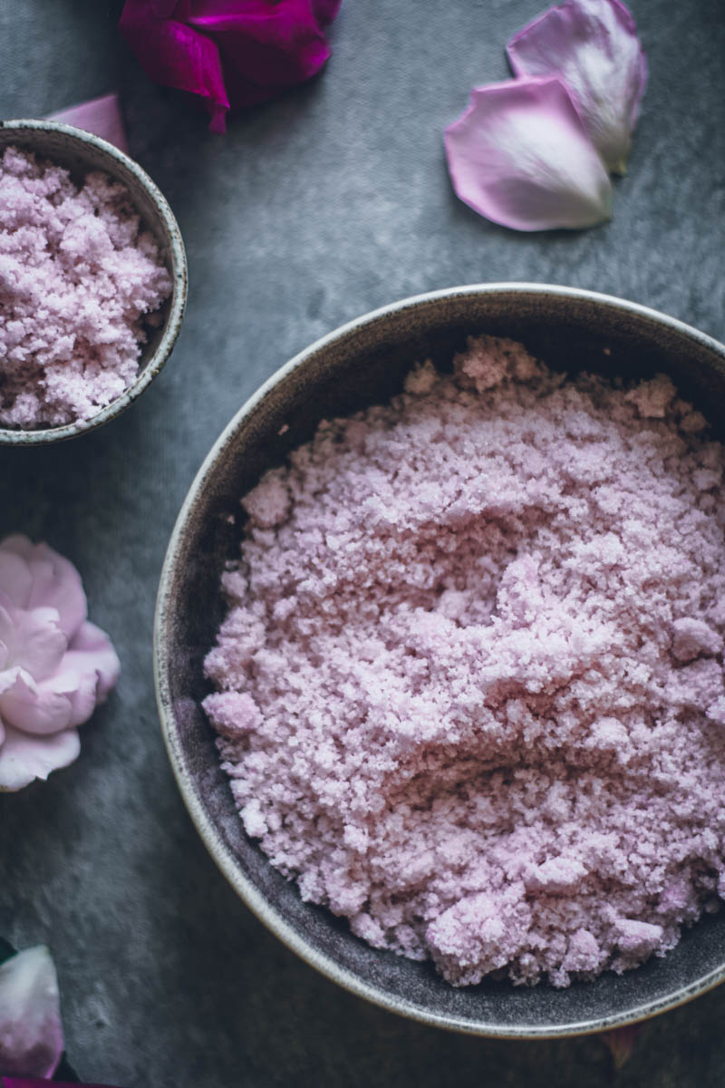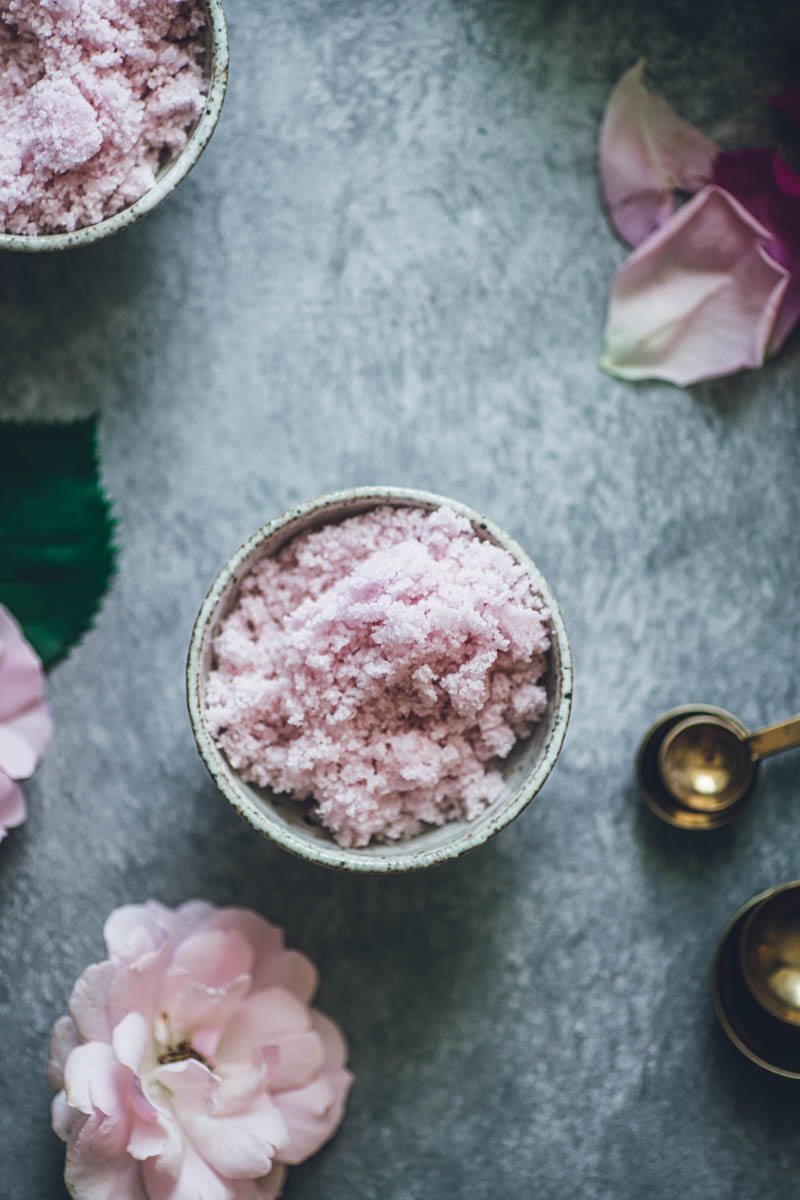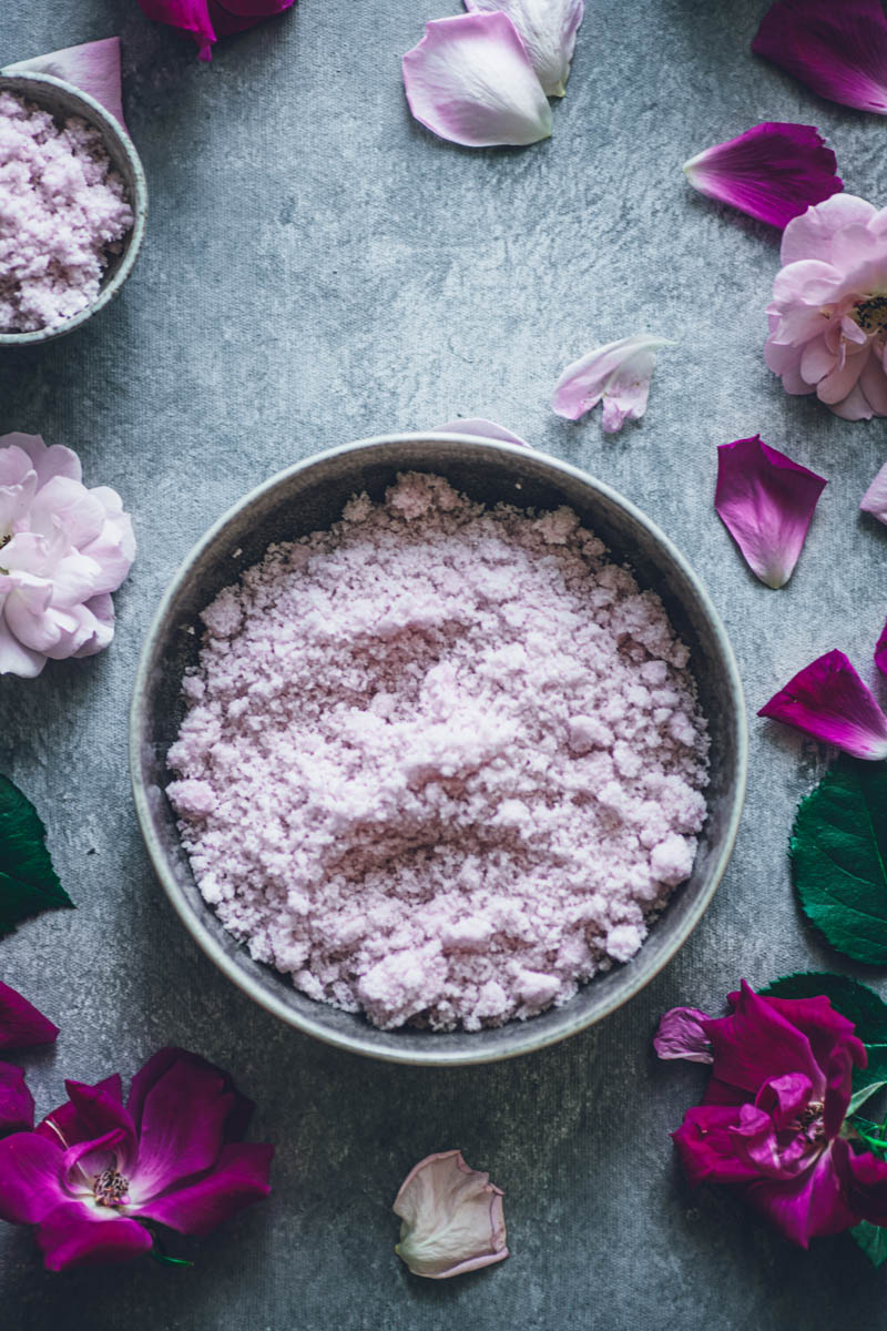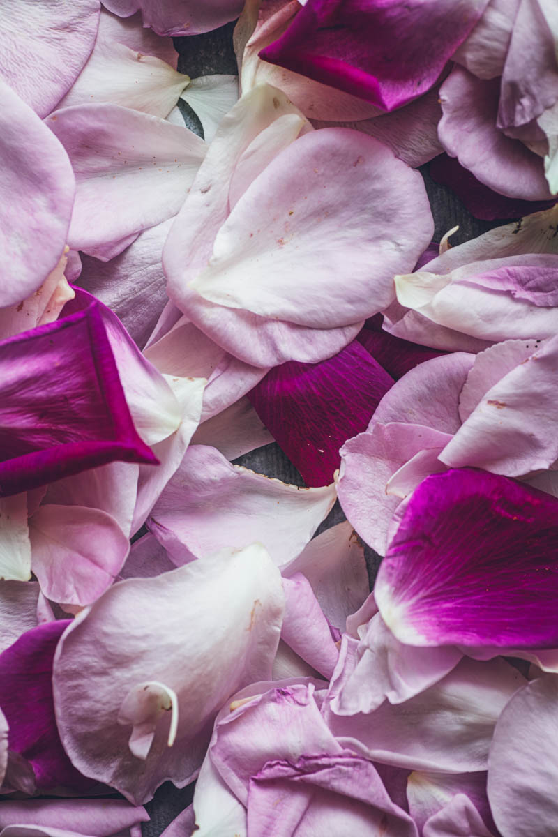Cukr i okvětní lístky navrstvíme střídavě do foodprocesoru nebo výkonnějšího mixeru. Mixujeme, dokud se všechny okvětní lístky nerozemelou a cukr nezíská růžovou barvu.
