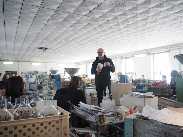 Při prohlídce jsme si prošli halu s pecí, kde se z olovnatého křišťálu vyfukovaly části skleněných lustrů pro Lasvit, který si je tu nechává vyrábět. Mně tahle ruční dovednost vždycky fascinovala.