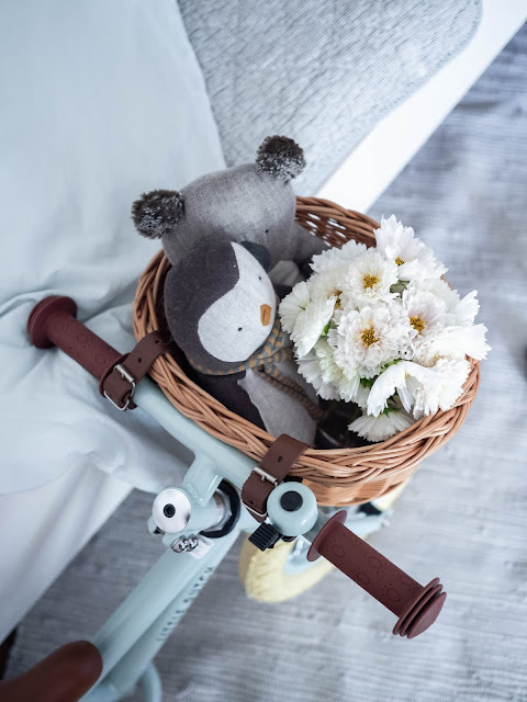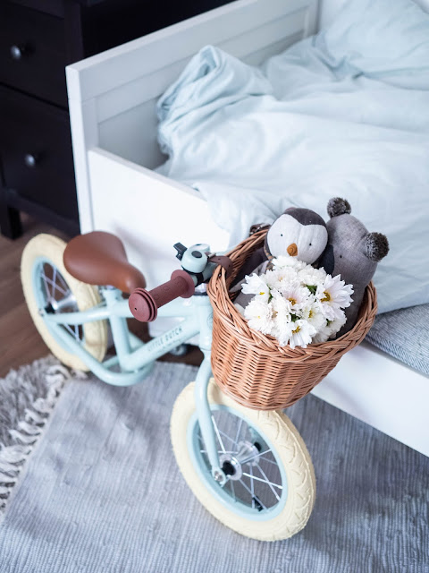 Náš velkáč dostal v lete na meniny odrážadlo a posledný prázdninový týždeň sa ho rozhodol konečne zabehať. Košík využíva na malé drobnosti, ktoré nájde cestou. Rovnako, ako kufrík na nočnom stolíku. Z dovolenky si priniesol zopár drobností - vyplavené drievko a kamienky robia spoločnosť drobným hračkám.