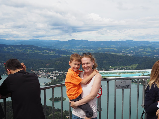 … na rozhlednu jsme vyšli po schodech. Bylo to super. Když jsem na Pyramidenkogel byla poprvé, vůbec jsem si schodů nevšimla 🙂 …