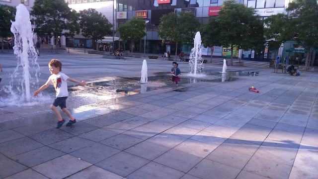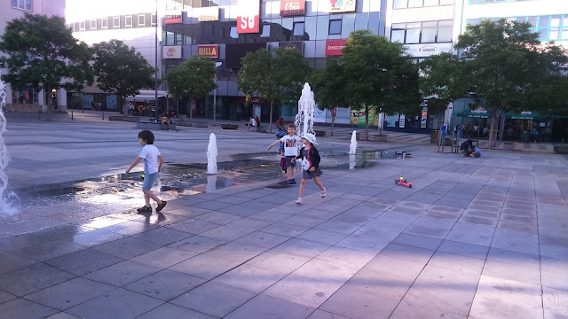 stahovala jsem fotky z mobilu a našla jsem tam tyto, ze začátku června. Šli jsme na tramvaj, bylo vedro a děti nenapadlo nic jiného, než se proběhnout stříkající vodou …