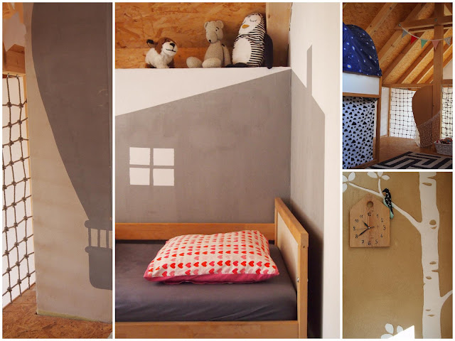 A toto už jsou obrázky z horní části pokoje, která byla původně myšlena hlavně jako spací, holky tam ale tráví hodně času i přes den. Jde tady hezky vidět zabezpečení schodiště sítí a dřevěnou zábranou ve tvaru balónu.