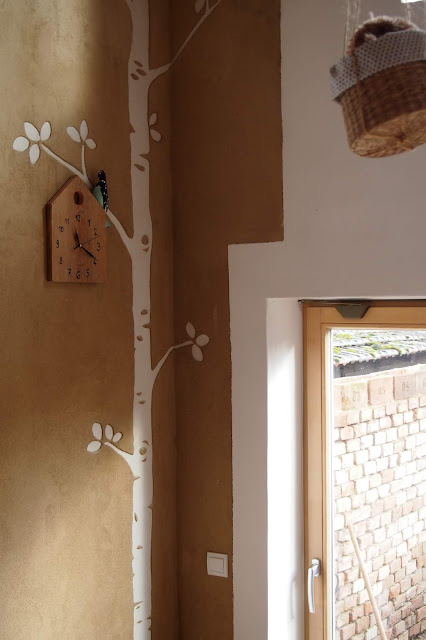 Protože je plocha spodní části pokoje opravdu maličkatá, rozhodli jsme se nechat jej otevřený až do krovu – není nad ním strop. Ochudili jsme se tak sice o další potenciální pokoj, ale nelitujeme – pokoj, ač malý, působí parádně vzdušně. Od podlahy až po střešní trámy nám roste strom, vyškrábaný do mokré hliněné omítky. Více o stromu čtěte kdyžtak tady..