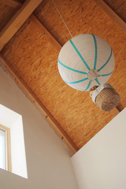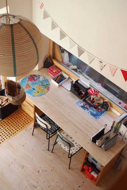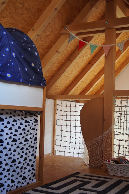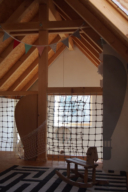 A toto už jsou obrázky z horní části pokoje, která byla původně myšlena hlavně jako spací, holky tam ale tráví hodně času i přes den. Jde tady hezky vidět zabezpečení schodiště sítí a dřevěnou zábranou ve tvaru balónu.