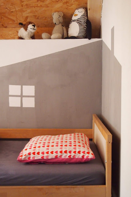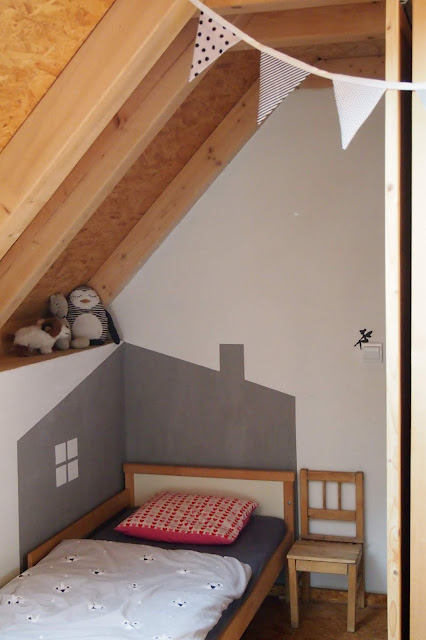 Novinkou letošního léta je Terezčina postel v rohu pokoje, naproti posuvným dveřím do šatny. Kout působil dost neútulně, v rámci krásně světlého pokoje je i dost tmavý, a tak jsem do rohu namalovala šedivý domeček. U Terezky sklidil naštěstí úspěch a hned se tam s radostí přestěhovala.