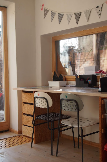 Psací stůl, který je dost dlouhý i široký (aby na něj vešel všechen holek tvořivý borčus). Dlouhé okno, které jsme probourali až dodatečně v průběhu stavby a na které nedám dopustit. A skvělé židle Peti Oringle..